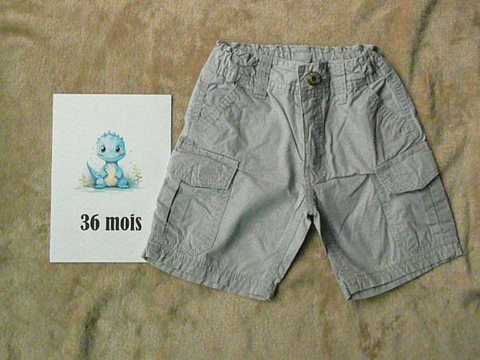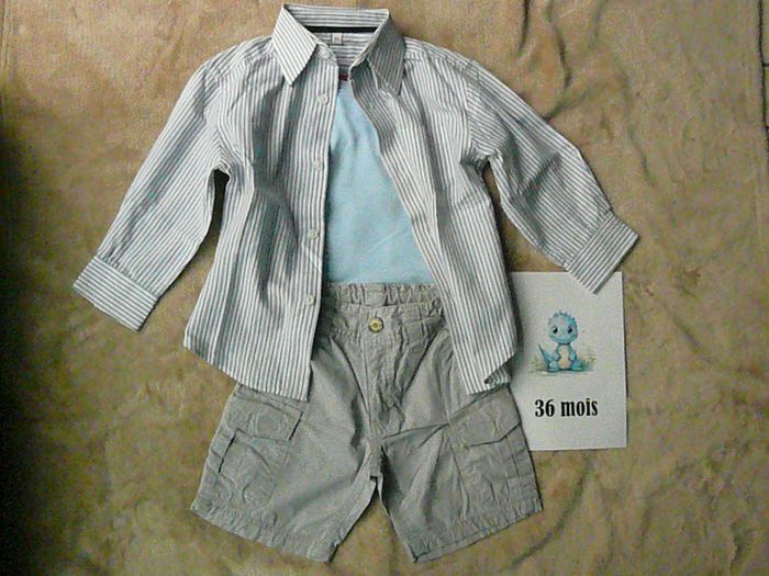 Ensemble 3 pièces taille 3 ans composé de : - Un short gris à fines rayures blanches – ceinture réglable, - Un tee-shirt bleu ciel assorti - Une chemise à rayures bleu marine. Etat neuf. N’hésitez pas à regarder mes autres annonces pour réduire les frais de port.