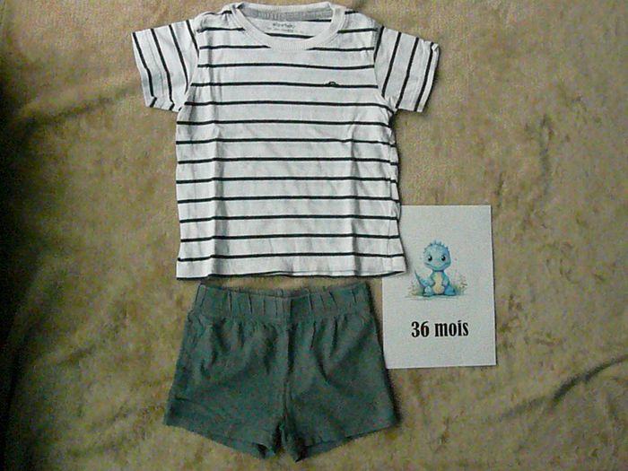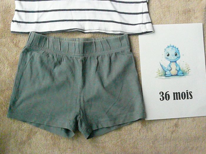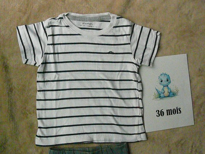Ensemble taille 3 ans composé de : - Un short gris - ceinture élastique, - Un tee-shirt blanc à rayures bleu marine. Etat neuf. Maison non-fumeur. N’hésitez pas à regarder mes autres annonces pour réduire les frais de port.