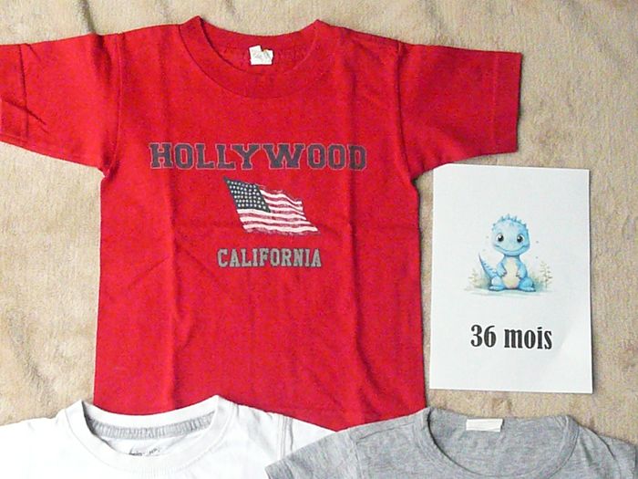 Lot de 3 tee-shirts Taille 3 ans : - 1 tee-shirt gris à motif, - 1 tee-shirt blanc, - 1 tee-shirt rouge Hollywood. Très bon état N’hésitez pas à regarder mes autres annonces pour réduire les frais de port.
