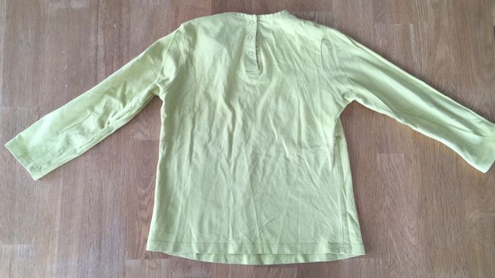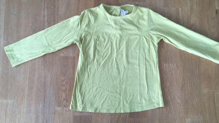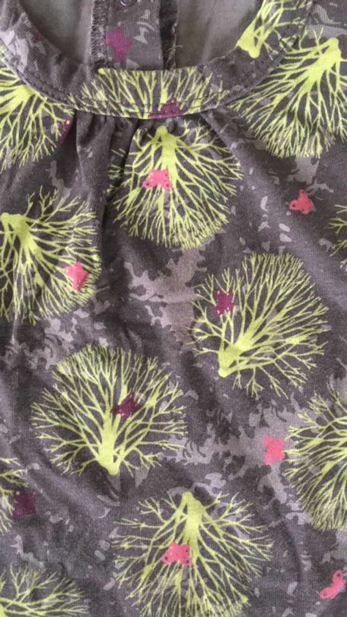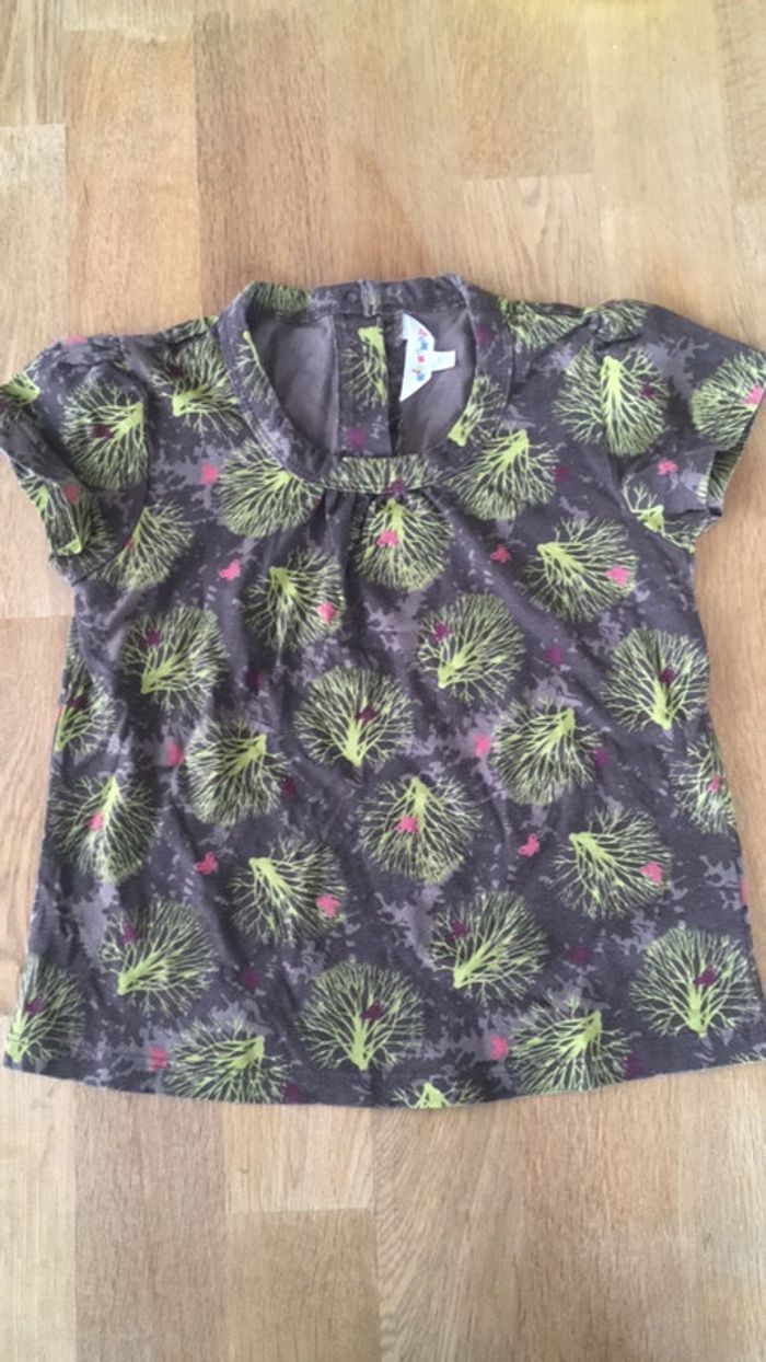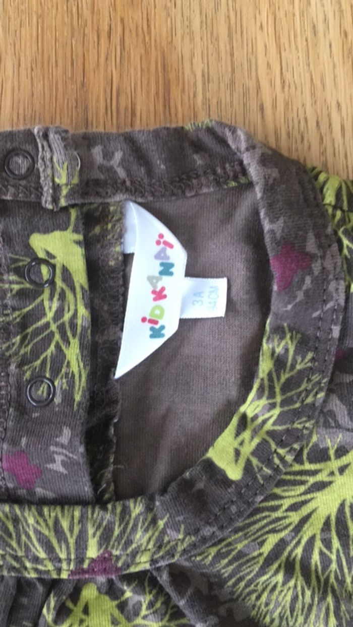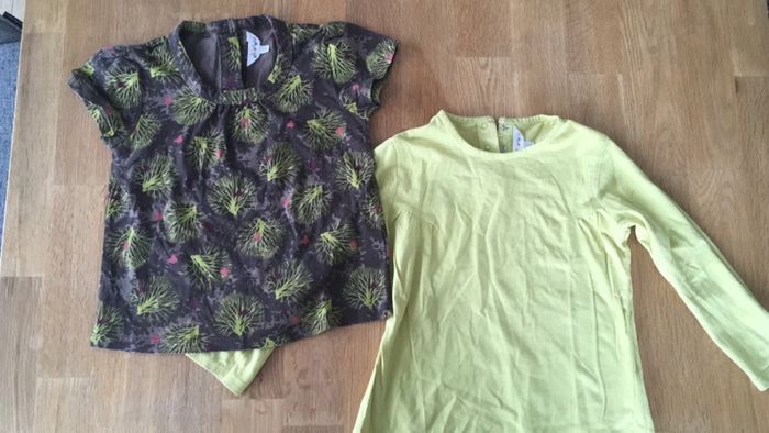 2 shirts superposables de la marque kidkanai , 1 t-shirt manches longues vert clair uni 1 t-shirt manches courtes marron avec arbres verts et petits papillons roses et violets