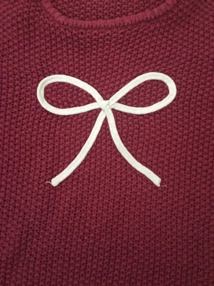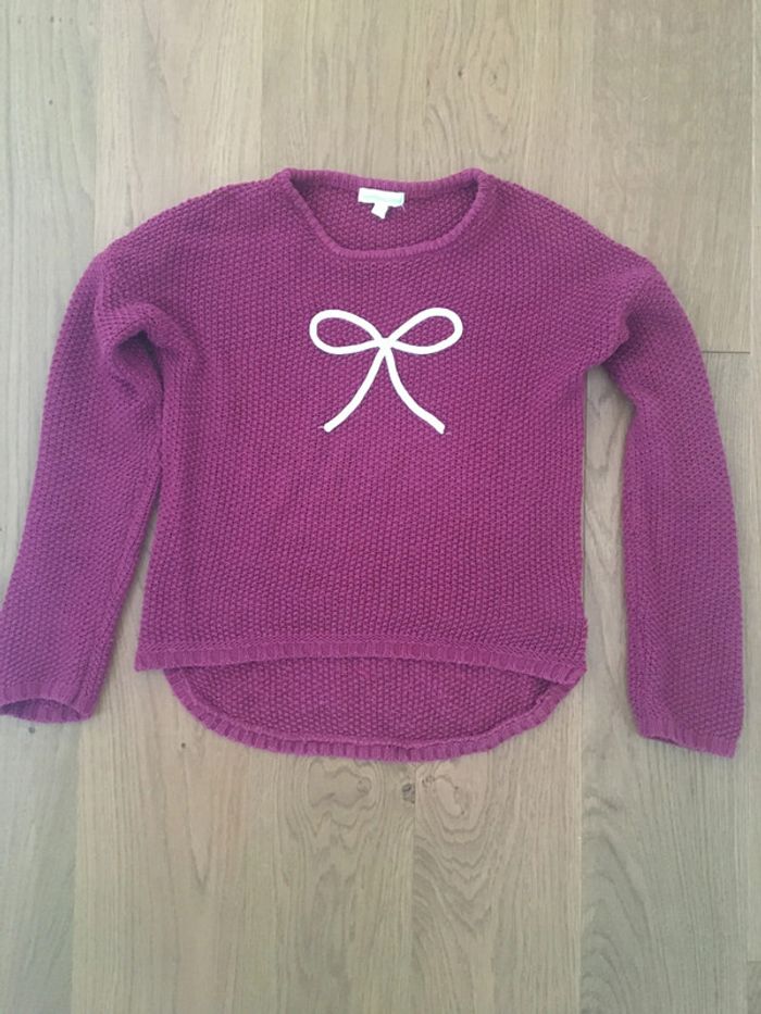 Pull Vertbaudet couleur Bordeaux Noeud blanc argenté Plus long derrière que devant Taille 8 ans