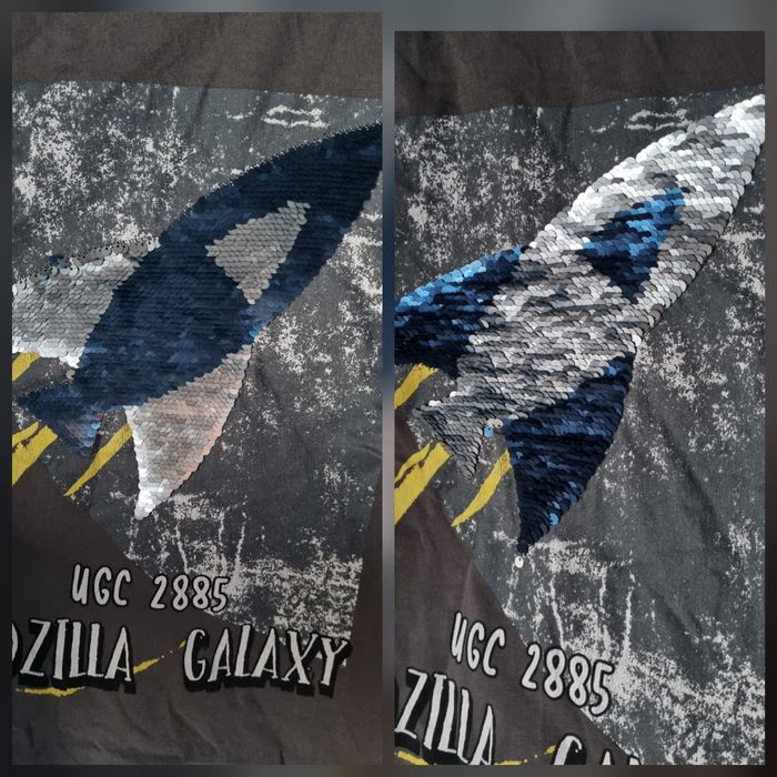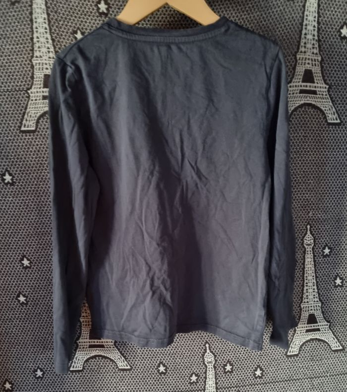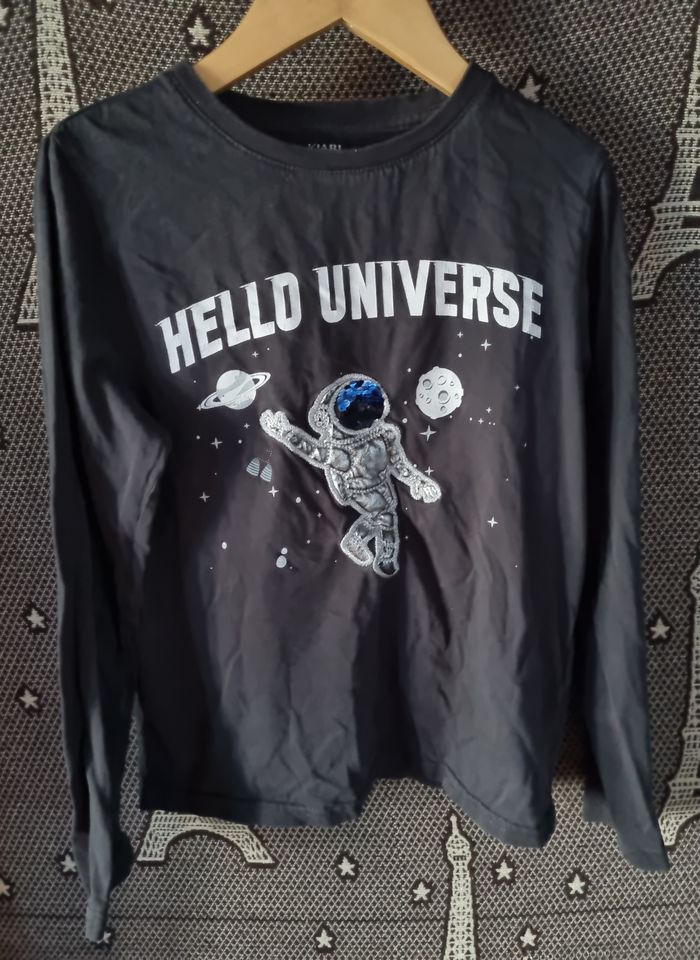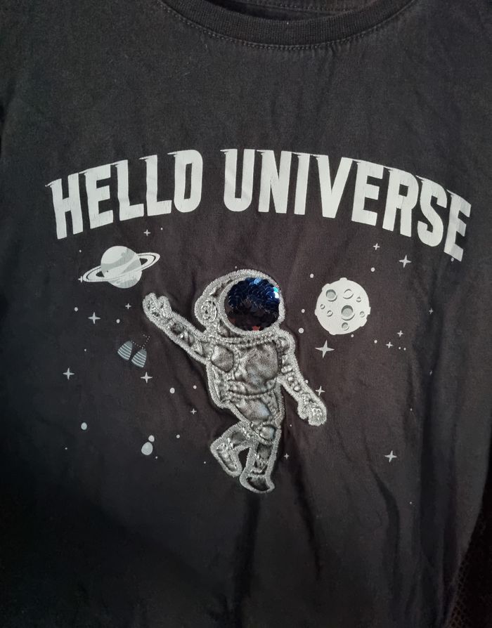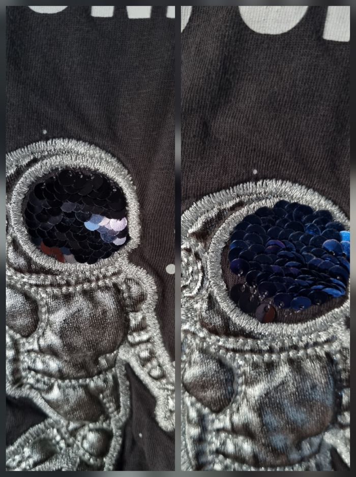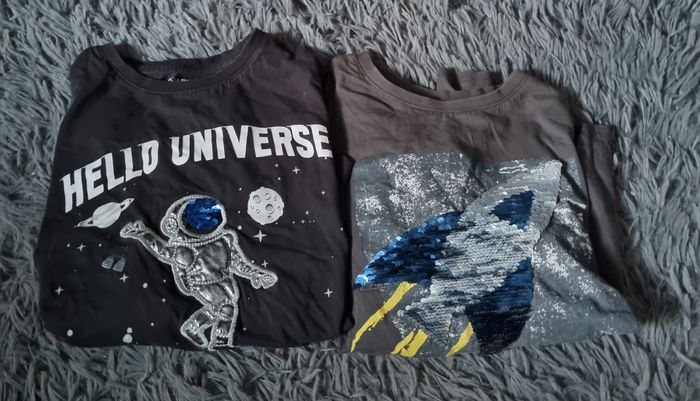 Lot 2 t-shirt à manches longues imprimée sur le thème de la Galaxie, taille 10ans marque Kiabi, - T-shirt manches longues noir avec Astronaute, la visière est en sequins réversible (bleu et argenté), -T-shirt manches longues gris avec fusée 🚀 en sequins réversible (bleu et argenté),imprimé effet vieilli.