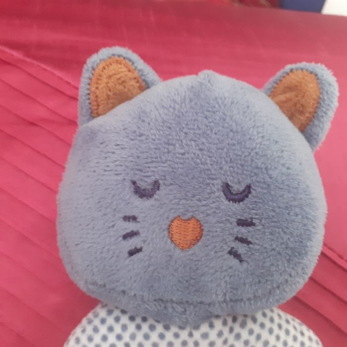 Doudou Chaton entièrement rembourré; yeux et museau brodés; en tissu velouté. Fait un bruit de grelot quand on le secoue. Hauteur totale de 14 cm; lavable à 30° // voir photos pour détails. À Noter : étiquette coupée