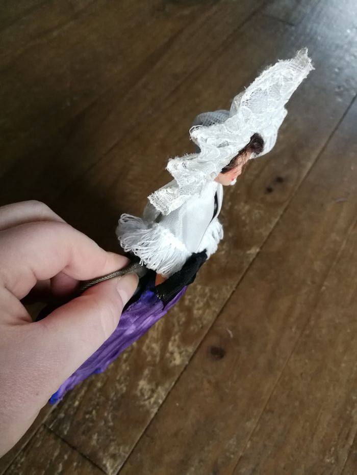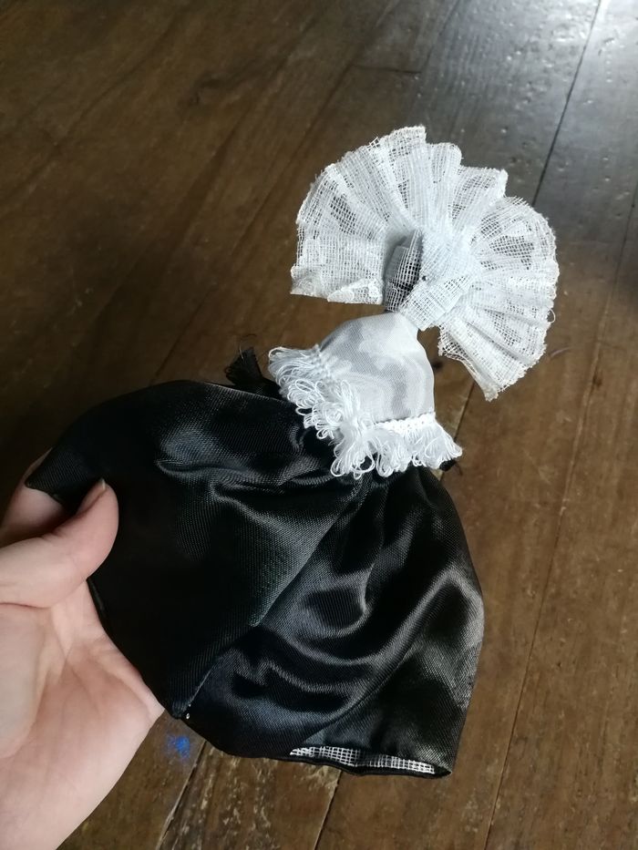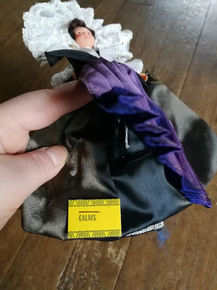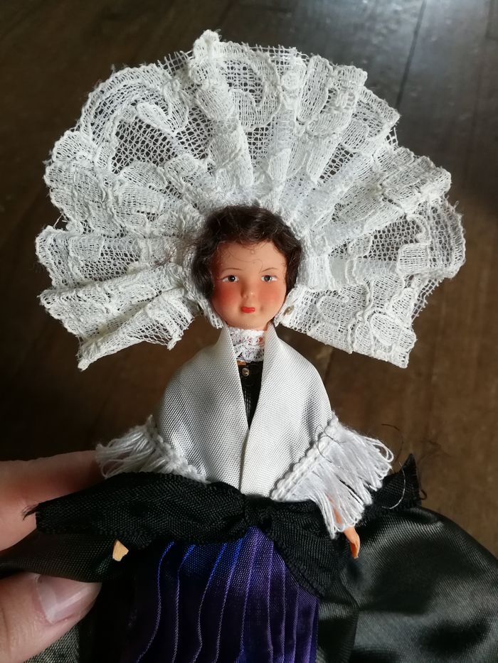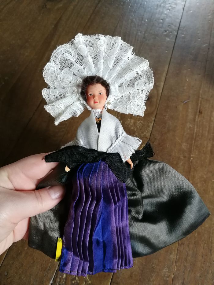 Calais poupée folklorique ancienne, en plastique ou celluloïd, en bon état général, la coiffe en dentelle blanche un peu jauni, la robe est en satin marron (décolorée/tachée) et violet (décolorée). Poupée des années 1970/1980, taille 20 cm.