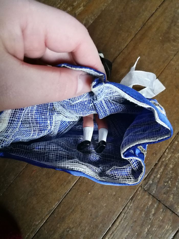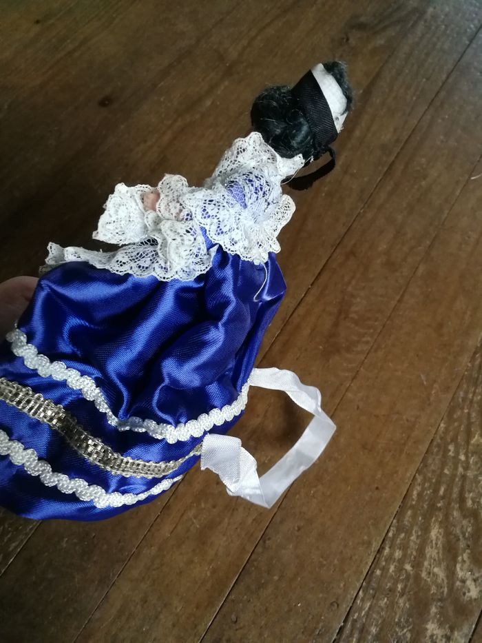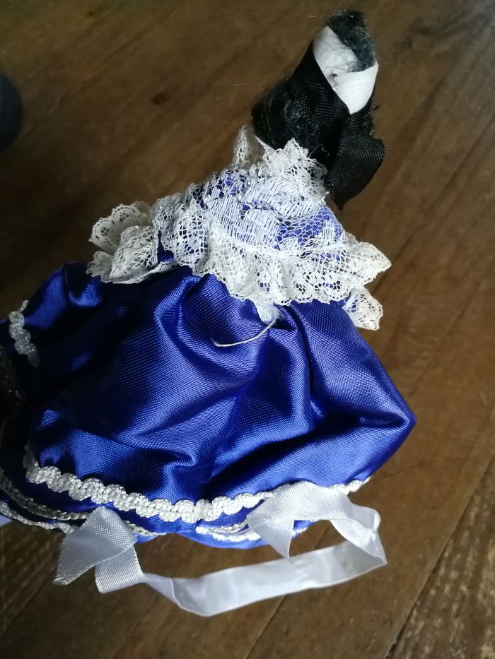 Poupée folklorique bretonne en robe bleue à dentelles, tablier est déchiré car dentelle est fragilisée, par son ancienneté 1970/1980. Robe de la poupée est en satin, le châle en dentelle, un peu jauni, cheveux noirs, poupée en plastique ou celluloïd en bon état général, les habits sont pliés. Taille 15 cm.
