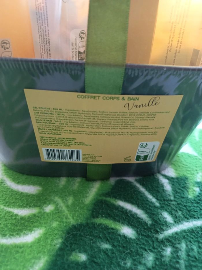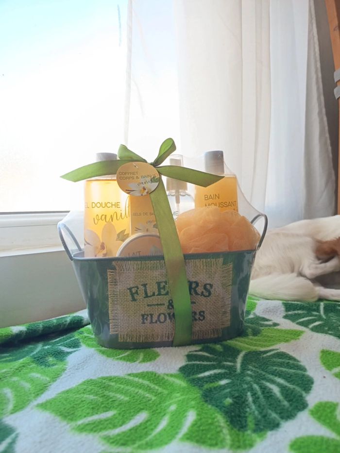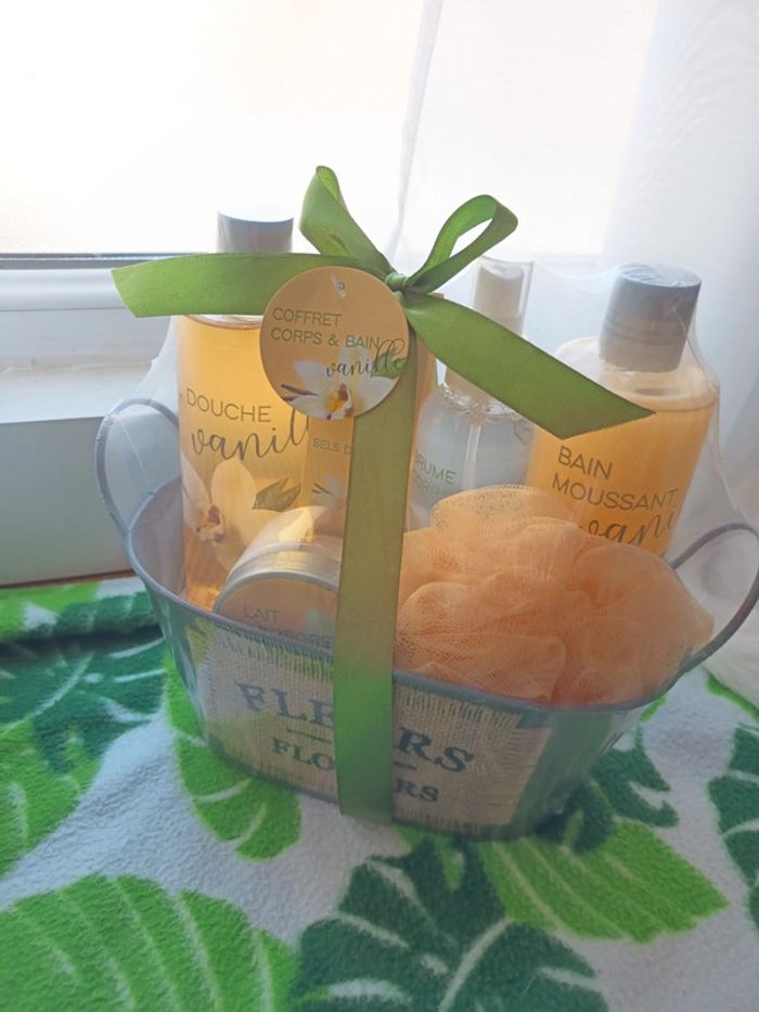 Coffret corps et bains vanille 1 bain moussant 300ml 1 fleur de massage 1brume 140 ml 1 sel de bain 100g lait corporel 120 ml 1 gel douche 300 ml avec 1 panier #soincatalina8