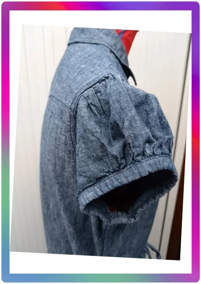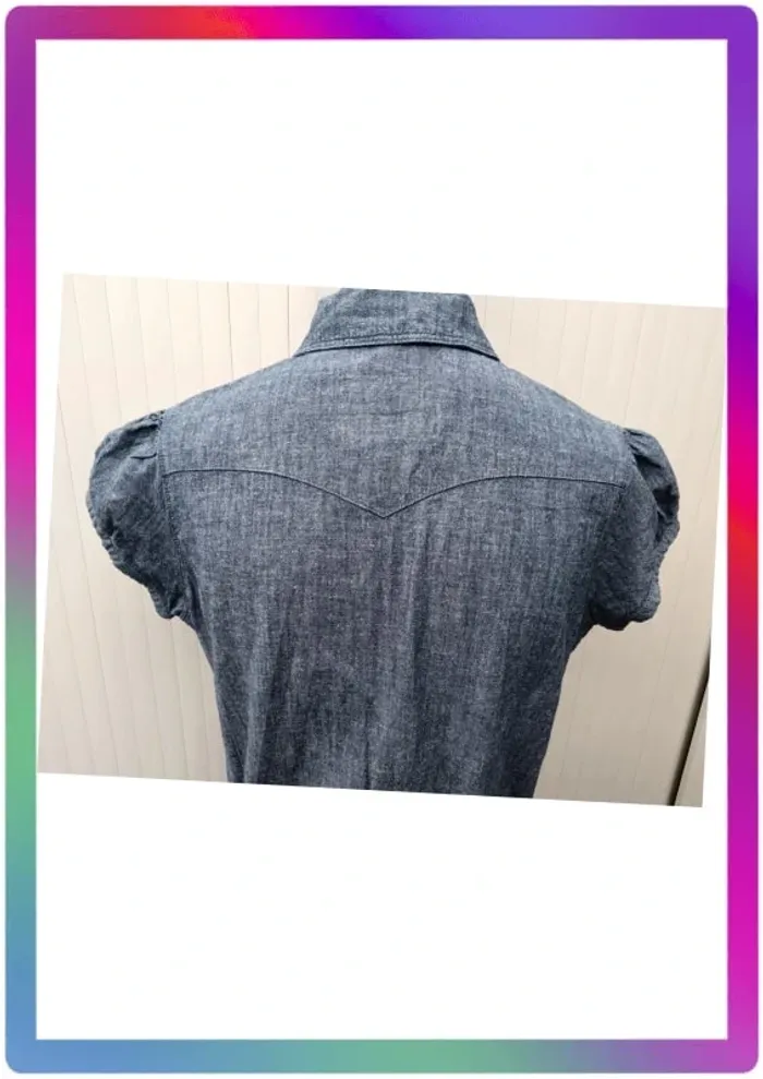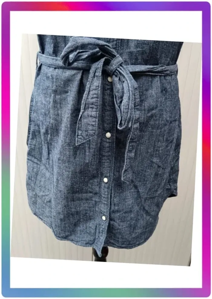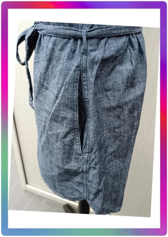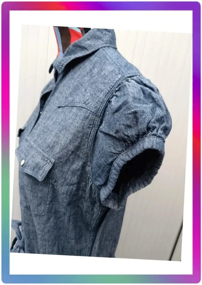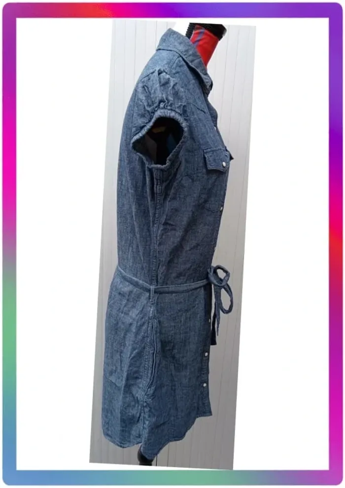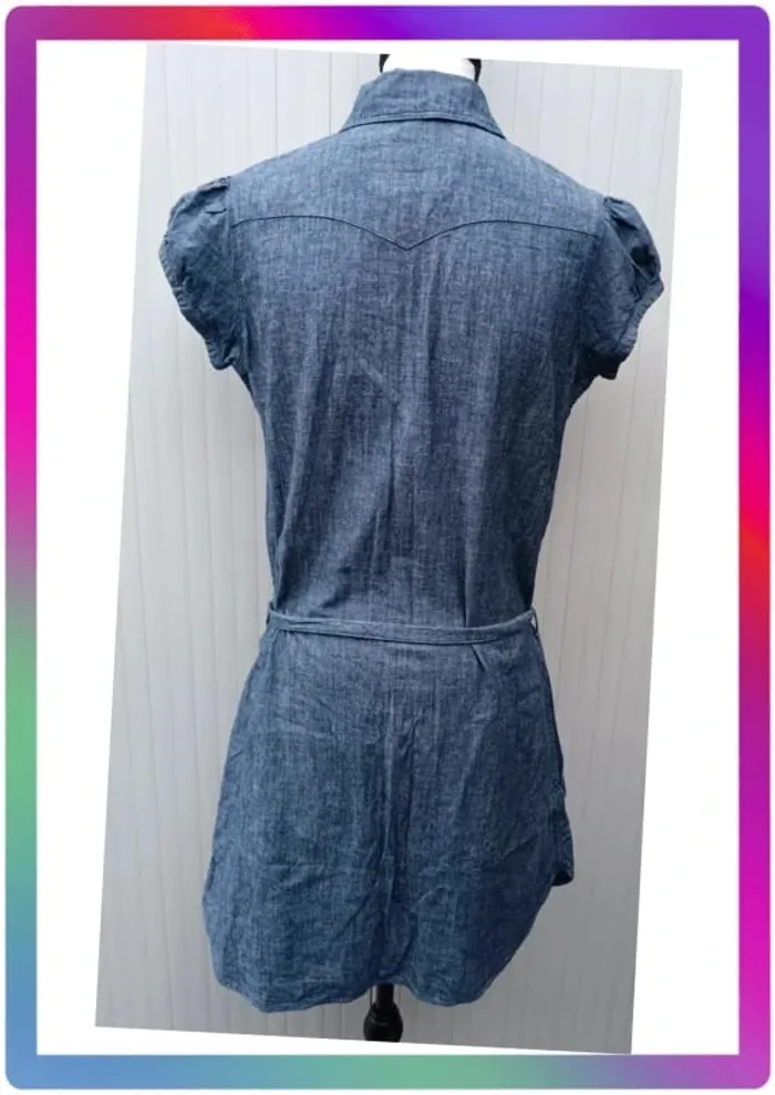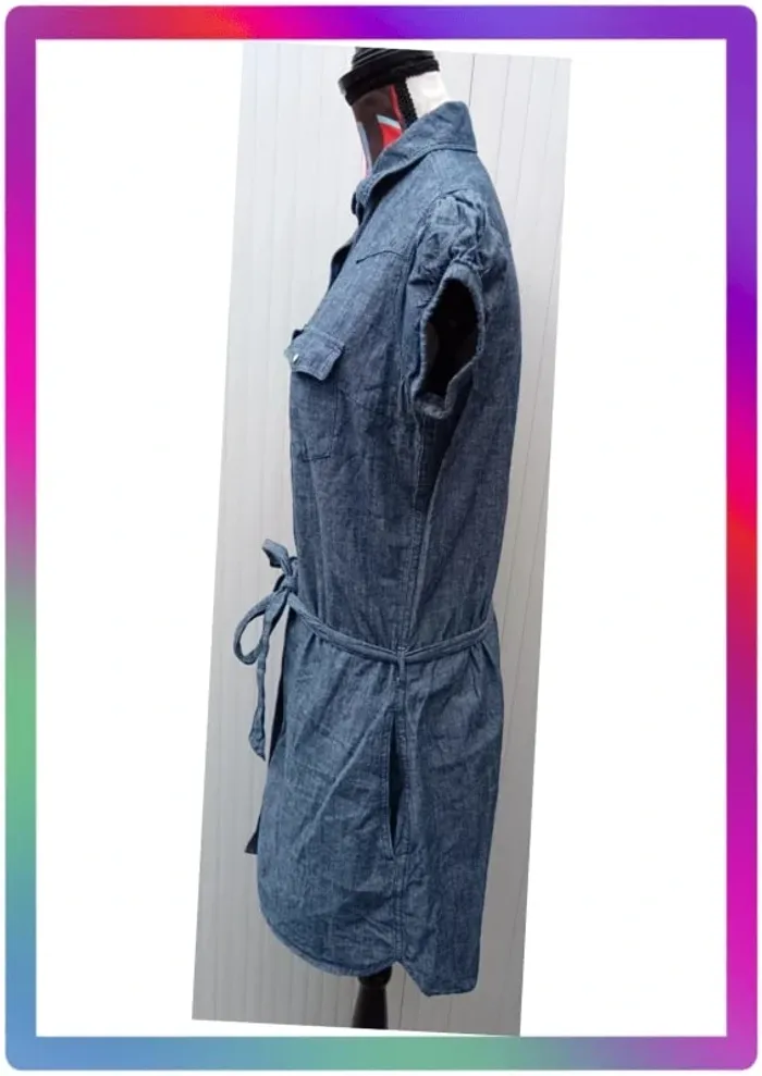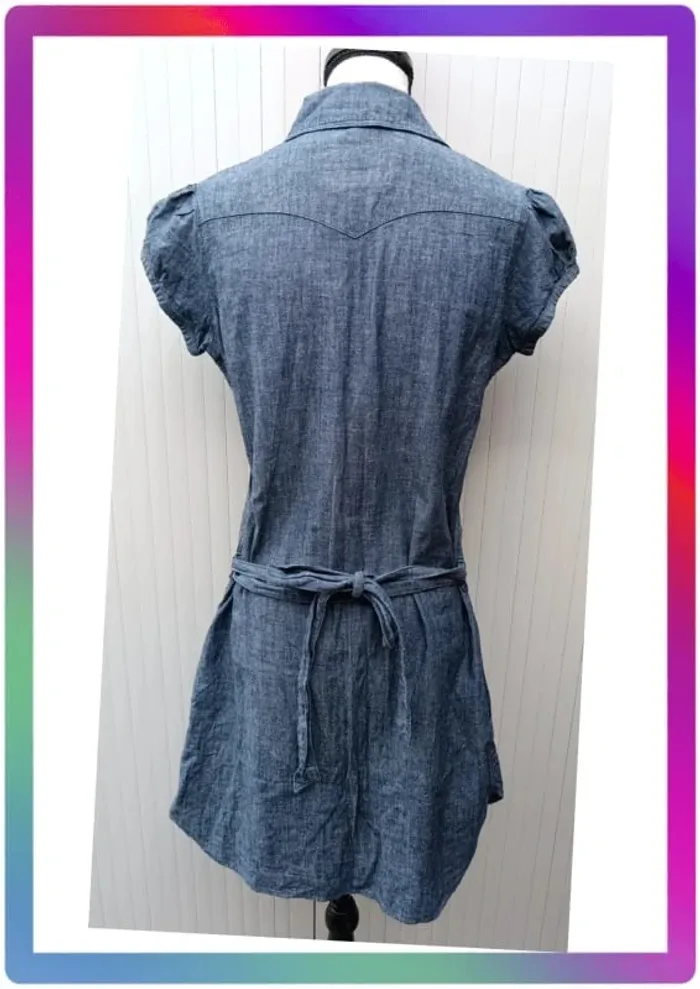 Robe jeans souple, manches courtes boutons pression, 2 poches à pression + 2 poches, ceinture. Arrive au-dessus des genoux. Aisselles à aisselles 48 cm, épaule à épaule 36 cm, longueur 85 cm #pitou83710femmeS N' hésitez pas à choisir votre point relais pour les frais de port ! J'ai tout les points relais