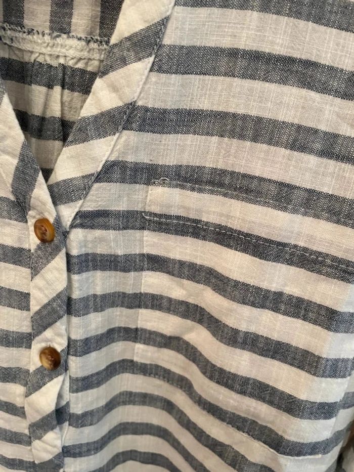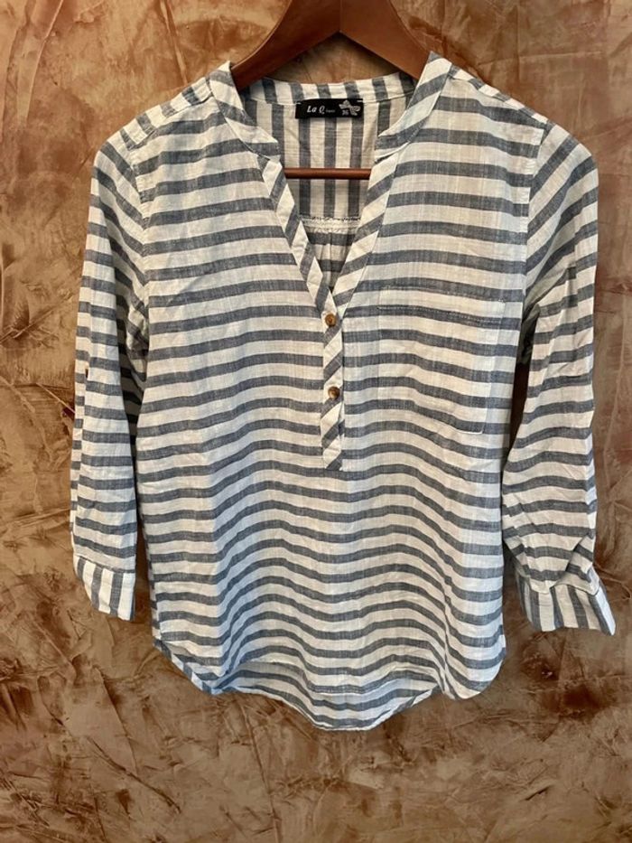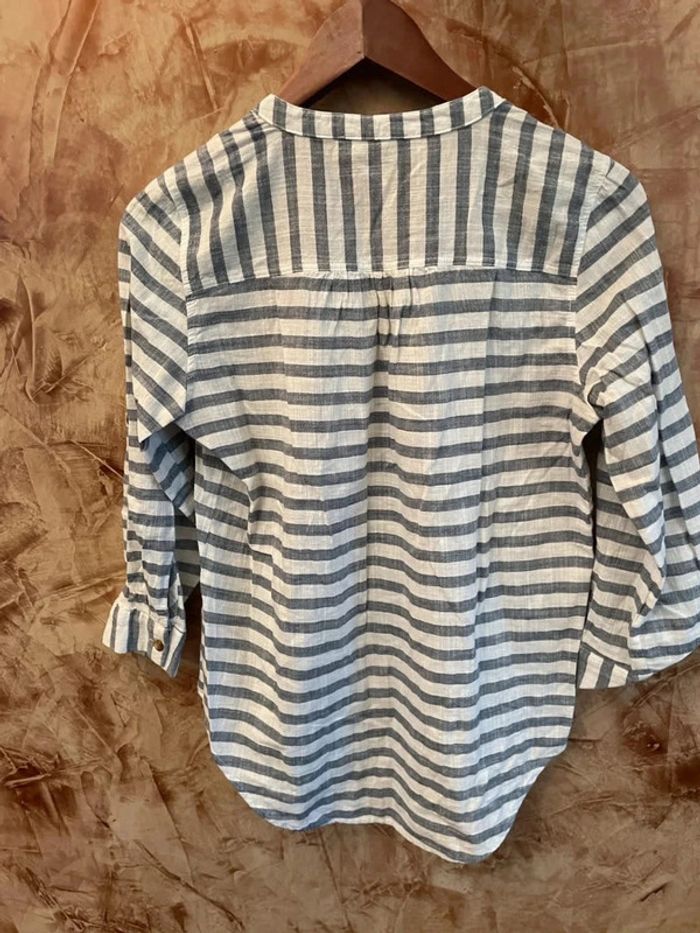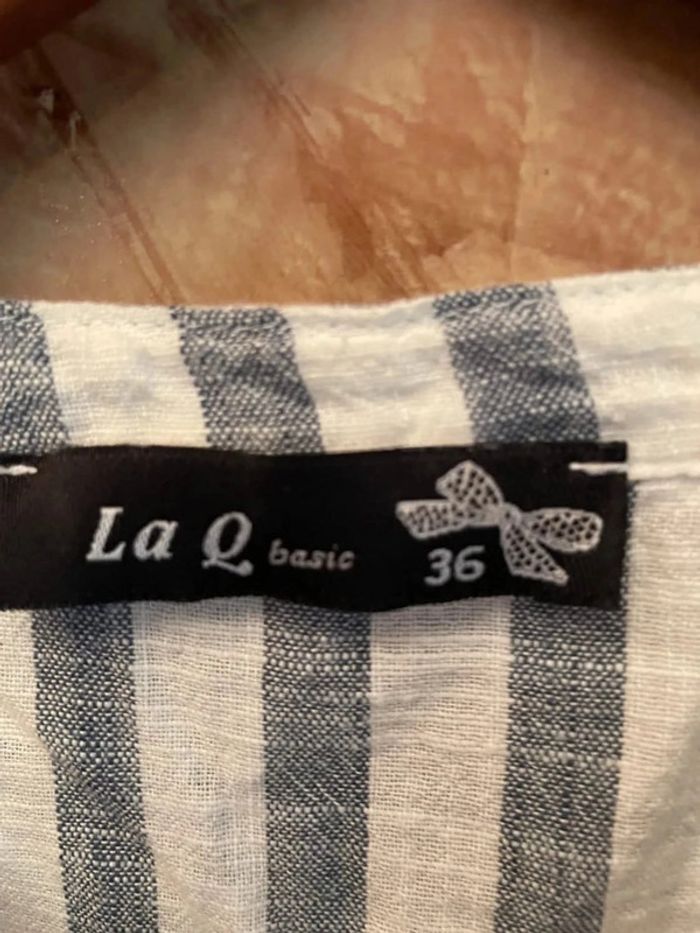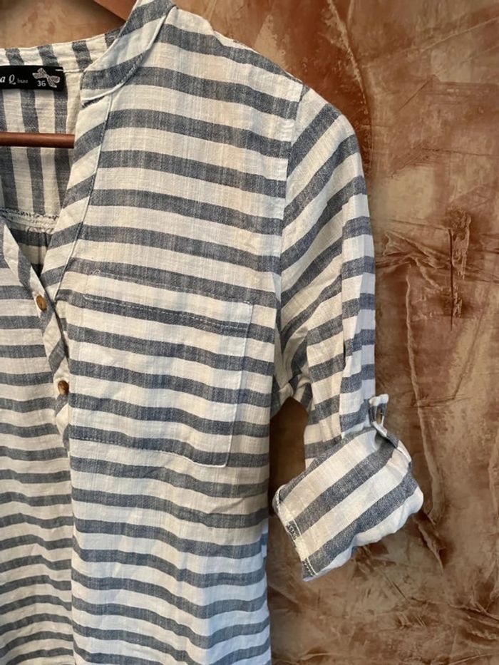 Blouse à rayures blanches et bleu jean (Taille S) 🌊👚 Cette jolie blouse à rayures blanches et bleu jean en tissu façon lin est dans un parfait état ✨. M ➡️ Taille S, idéale pour un look décontracté et élégant. ➡️ Marque : la Q basic • Manches ajustables : peuvent être remontées et fixées grâce à un bouton 🔝 • Col en V avec des boutons pour une touche chic 💙 • Petite poche sur le cœur pour un détail sympa 💖 Confortable et légère, elle est parfaite pour la mi-saison ! 🍃 N’hésitez pas à me contacter pour plus de photos ou d’infos. 📩 🛒 Lots avec remise avec le #nojolilifemme36 📦 Colis soignés et expédition rapide tous transporteurs