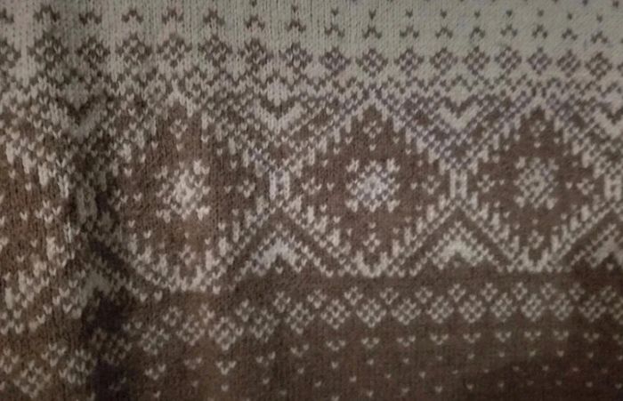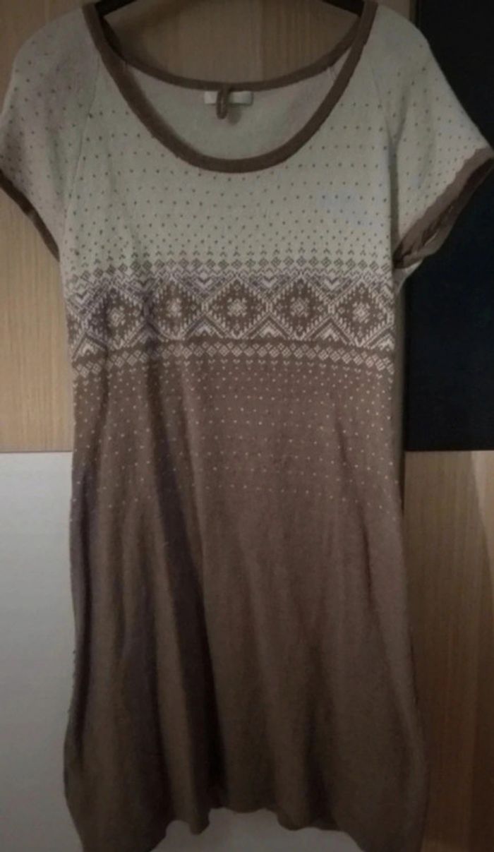 Jolie robe motifs jacquard hiver. Marron clair et beige. Manches courtes Un peu boullochée par les lavages #Lmadamepirate