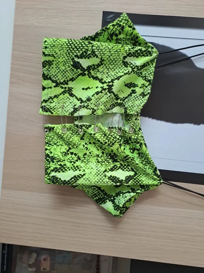 Petit haut bretelles élastiques Très court genre bralette Look punk rock Vert imprimé serpent avec épingles à nourrice pour fermer devant Taille unique