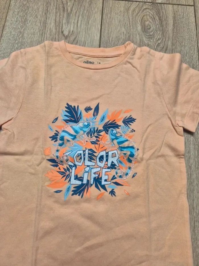 JE N'ACCEPTE PAS D'OFFRE MERCI Tee-shirt Manches courtes gémo abricot "gecko" salamandre motif "animé" inscription "color life" 4 ans en très bon état Pour visualiser tous ce que je possède en 4 ans garçon : #ambre626904ansgarçon