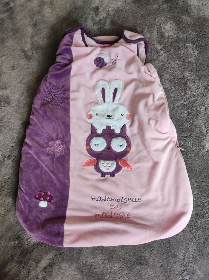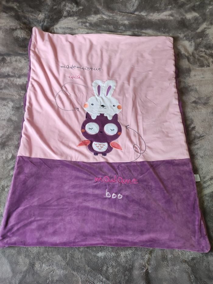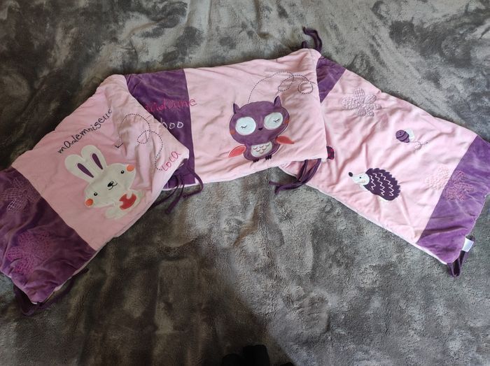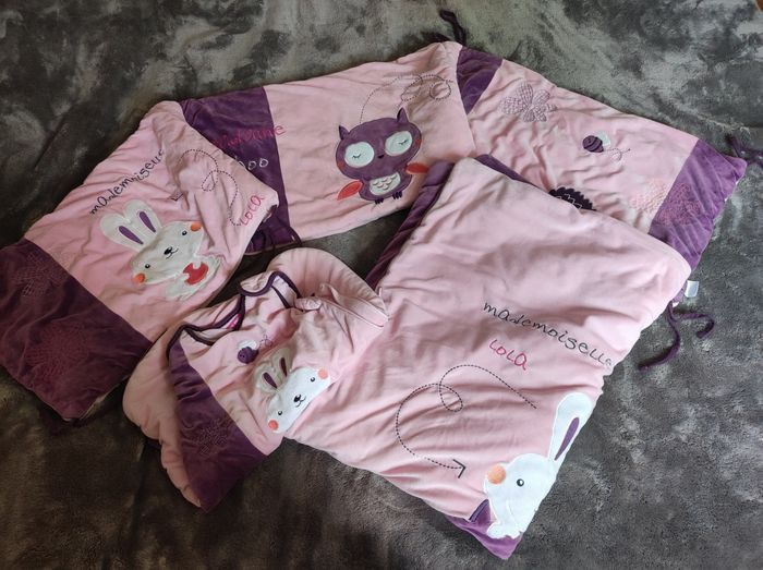 Ensemble de lit pour bébé, composé d'un tour de lit, d'une gigoteuse et d'une couverture. Le tout d'une matière toute douce, très peu servie cause double emploi.