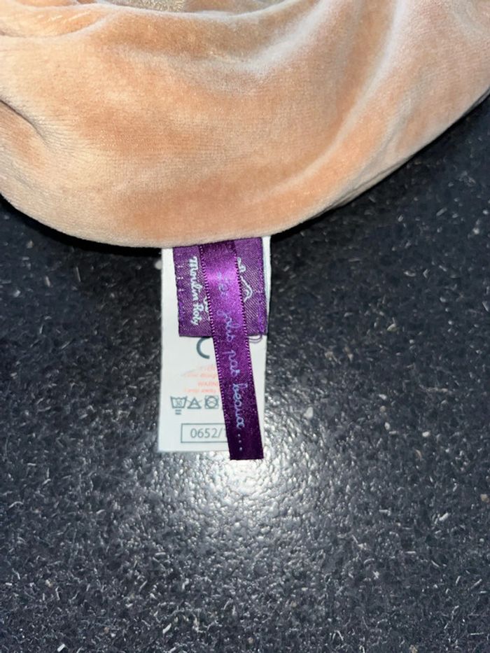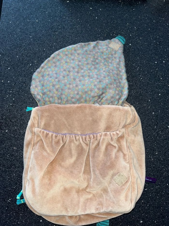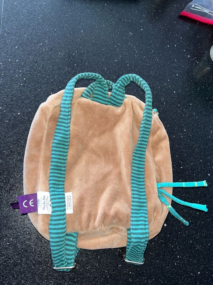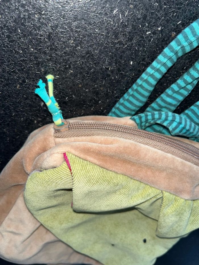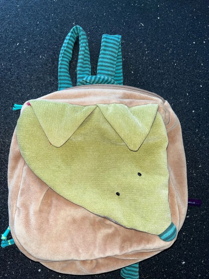 Peluche doudou, velours, marron vert, une première poche, fermeture scratch élastiquée une deuxième poche, fermeture, zip, éclair, hauteur environ une bonne vingtaine de centimètres intérieur tissu bleu clair de la marque moulin Roty Les bretelles sont réglables À été peu utilisé Simplement à signaler Non prénom sur étiquette blanche ou stylo