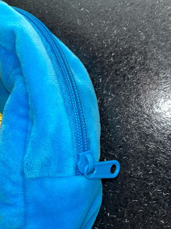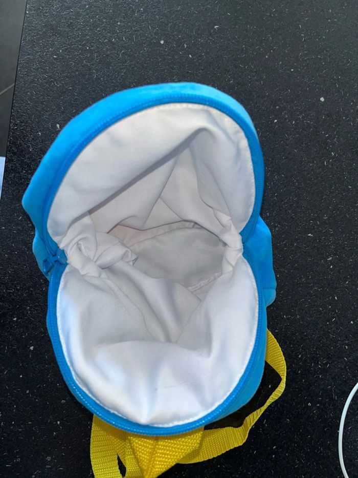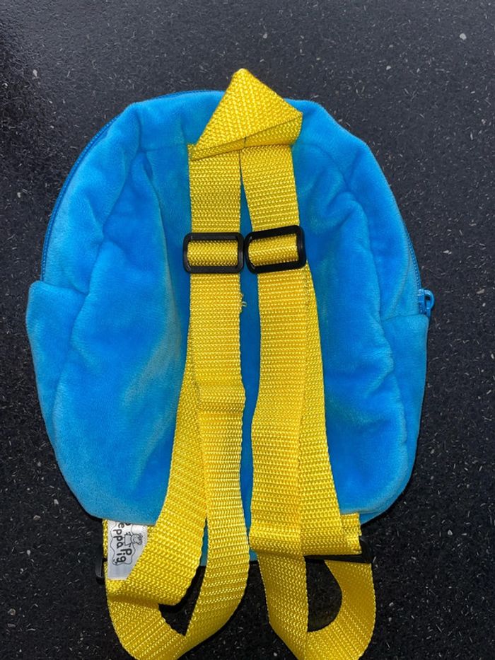 Doudou sac à dos pour la maternelle ou crèche ou pour aller chez nounou Environ 20 cm de hauteur en velours bleu imprimé Peppa Pig sur le devant fermeture zip éclair sur le dessus grande ouverture, les bretelles sont jaunes réglables poignée également pour tenir à la main L’intérieur en tissu blanc excellent état car non utilisé