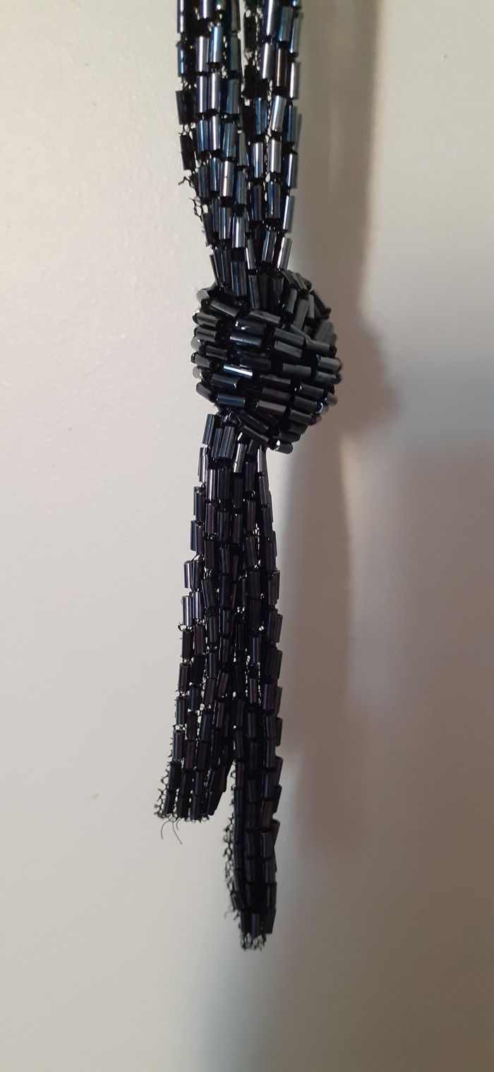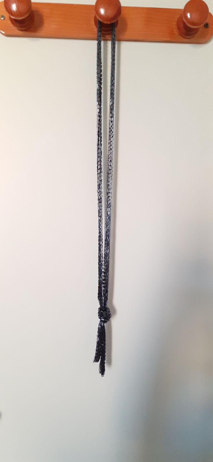 Vends un collier en bakélite noir, plat, noué devant, sans sautoir, longueur 59 cm.