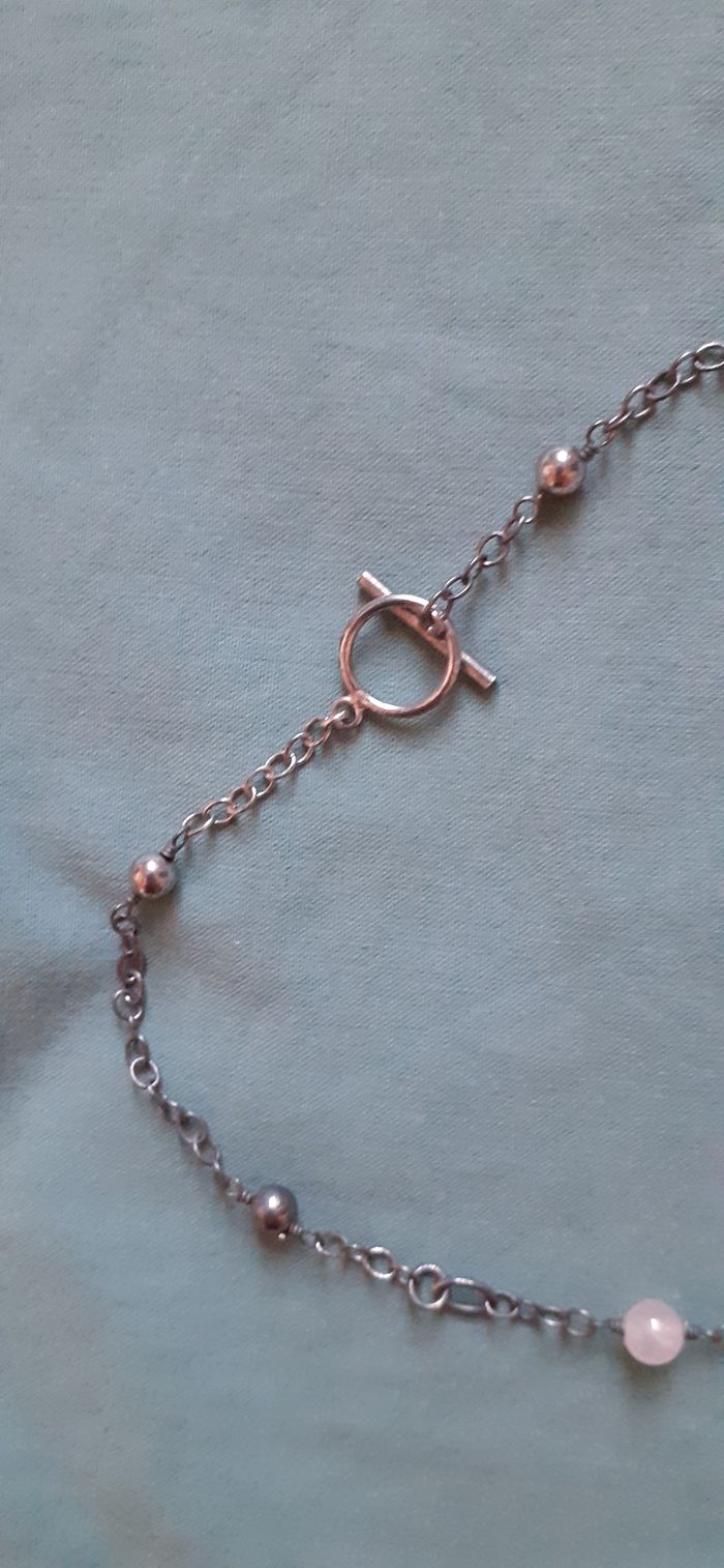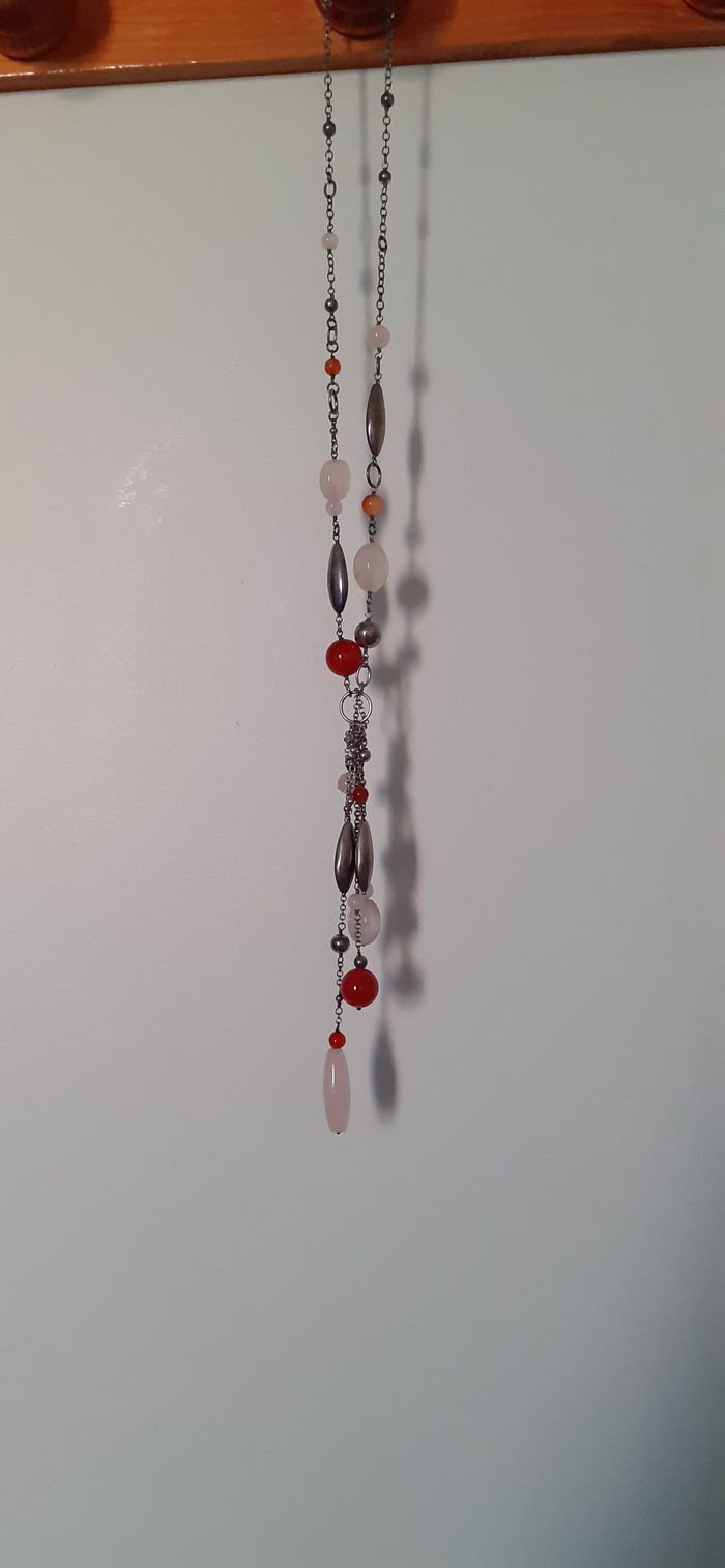 Vends un collier chaîne argenté et pierres en quartz rose et brun, sautoir, longueur 45 cm.