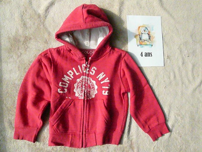 Veste zippée à capuche - taille 4 ans. Matière sweat. Avec 2 poches. Très bon état. N’hésitez pas à regarder mes autres annonces pour réduire les frais de port.