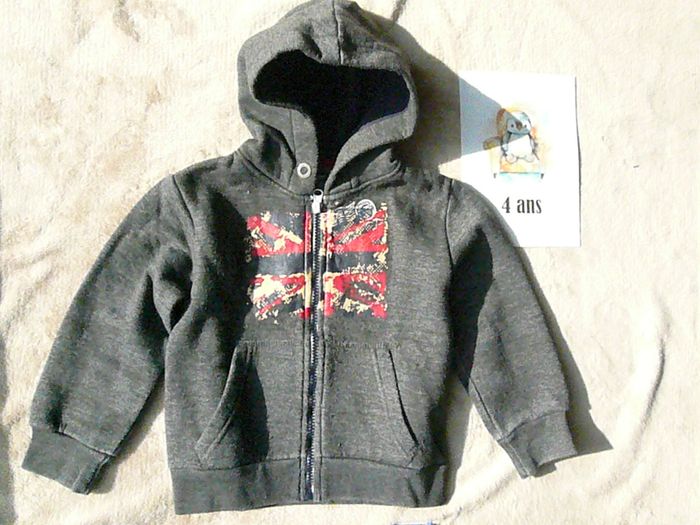 Veste zippée gris foncé – taille 4 ans. Matière sweat. Avec 2 poches. Très bon état. N’hésitez pas à regarder mes autres annonces pour réduire les frais de port.