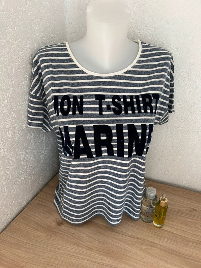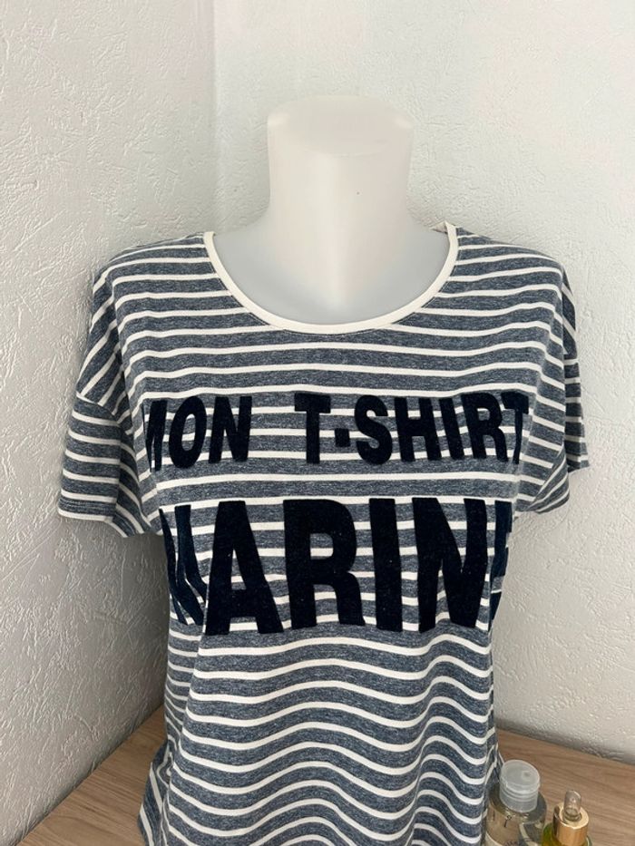 👕 Captivez avec ce style marin unique ! Le t-shirt présente des rayures horizontales bleues et blanches. Un motif en velours noir "MON T-SHIRT MARIN" orne le devant. Le col est rond avec une bordure blanche contrastante. 🐚 Les manches sont courtes, et la coupe semble être décontractée, idéale pour différentes silhouettes. L'article ne présente pas d'imperfections visibles. - 📏 Taille : L - 🏷️ Marque : Kiabi - 🌿 Matières : Non spécifiées - 🎨 Couleur : Bleu et blanc - 📦 État : excellent état 🛍️ Parfait pour une promenade en bord de mer avec un jean blanc. 🎉 Idéal pour une soirée décontractée avec des amis. 👟 Associez-le à des baskets pour un look urbain chic. #Kiabi #TshirtMarin #ModeFemme #Rayures #LookDécontracté #StyleNautique #CasualWear #Fashion #BlueAndWhite #SummerFashion #StreetStyle #WardrobeEssentials #ComfortWear #GraphicTee #Chic