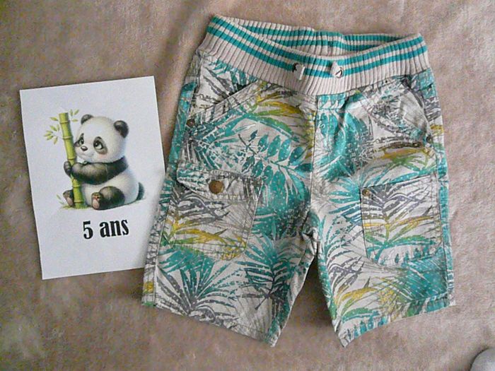 Ensemble 3 pièces composé de : - 1 short beige motif feuilles avec ceinture élastique, - 1 tee-shirt turquoise assorti, - Une chemise bleue pétrole – manches longues pouvant être repliées. Etat neuf. N’hésitez pas à regarder mes autres annonces pour réduire les frais de port.
