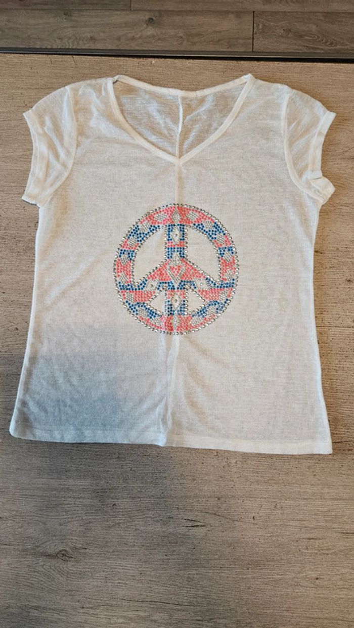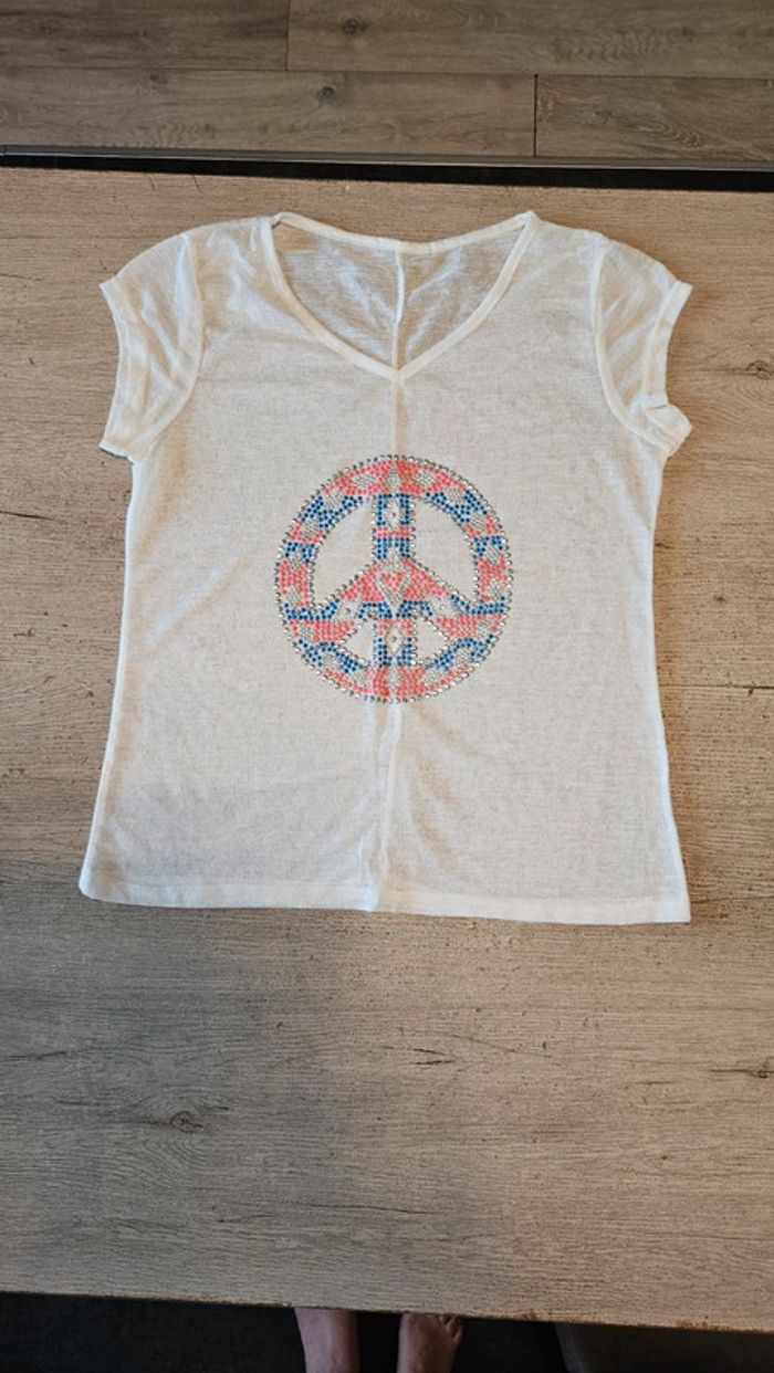 T shirt femme qui mesure 48 cm d aisselle à aisselle et 47 cm à la taille. Il n a été mis qu une fois, donc nickel. Col v. Le t shirt est transparent, très fin. Plus d étiquette. Avec sequond fushia, grid et bleu. #deborahtock_femmeL #deborahtock_femmeM