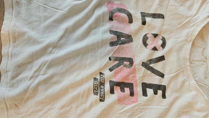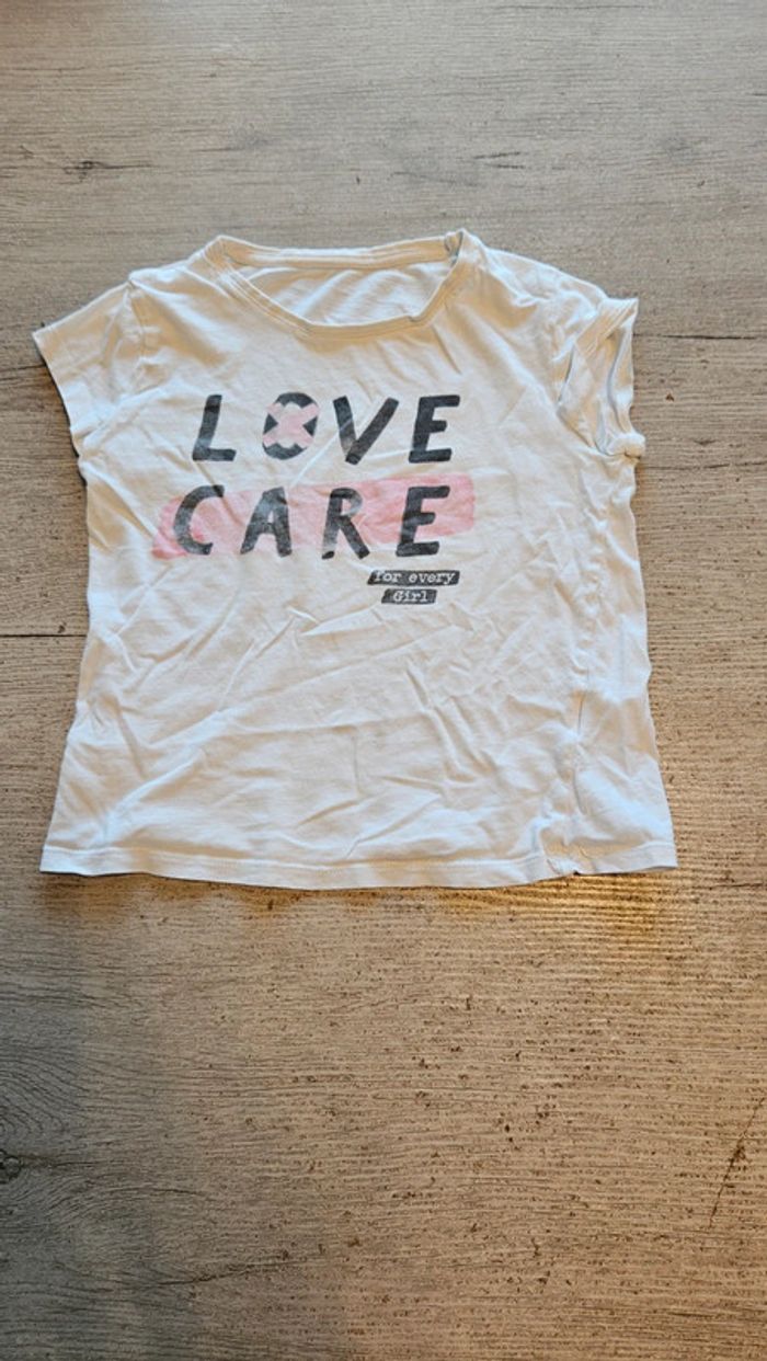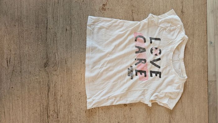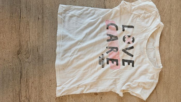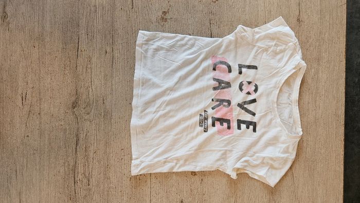 T shirt pour fille blanc avec dessin. Col rond. Mis mais encore bien. Attention, 1 micro tache devant, en dessous du dessin. #deborahtock_8ans