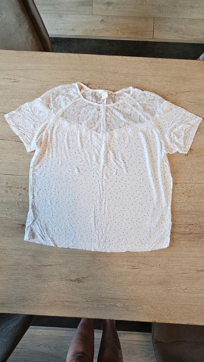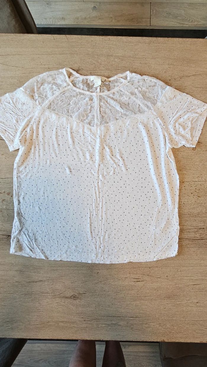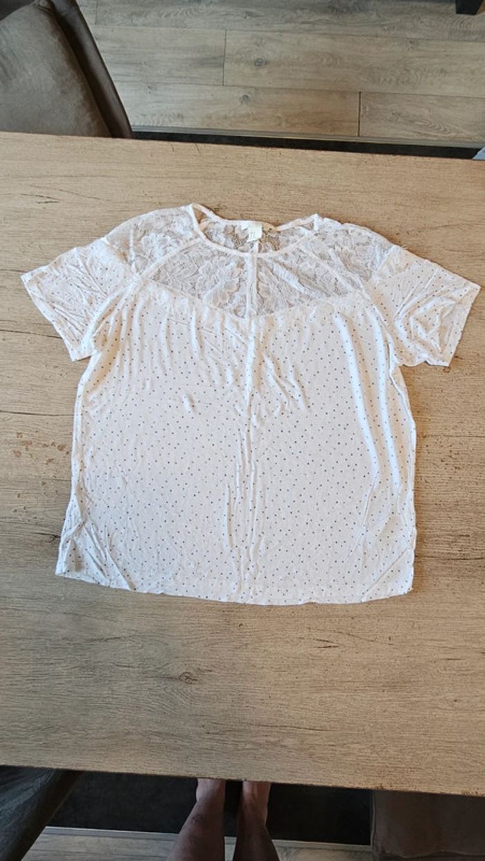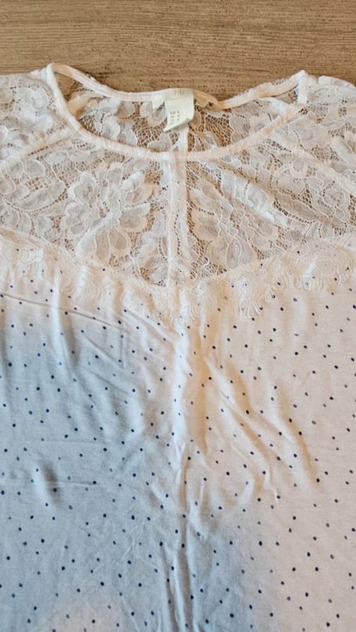 Blouse blanche à manches courtes avec points bleus et dentelles, H&M, M, nickel - photo numéro 1