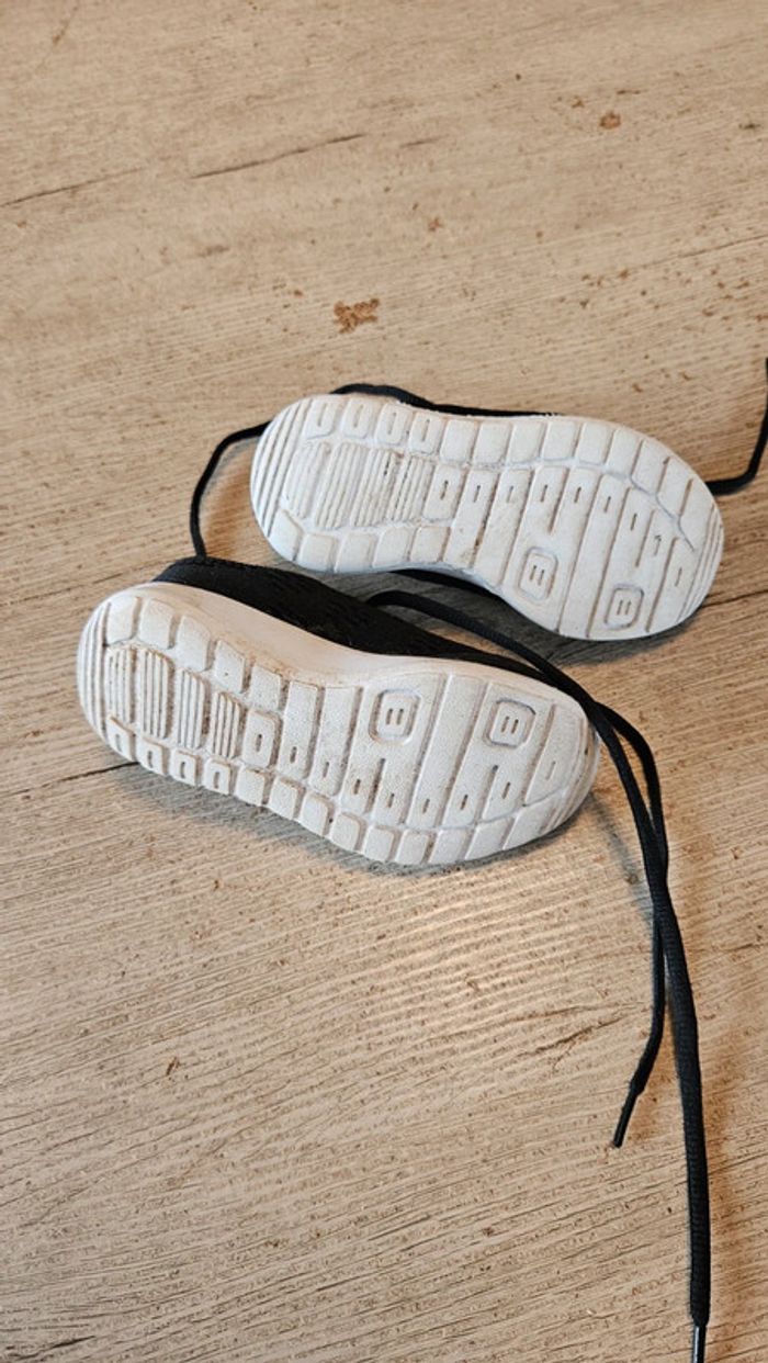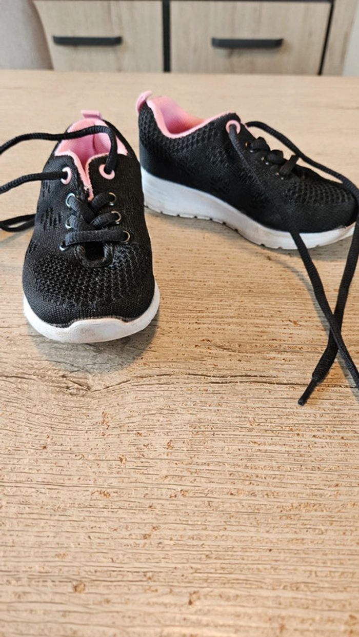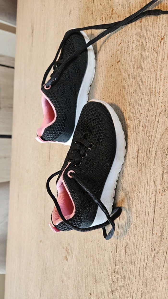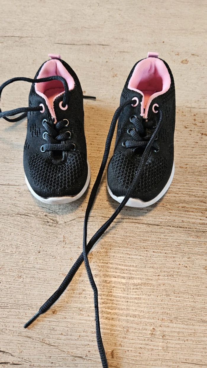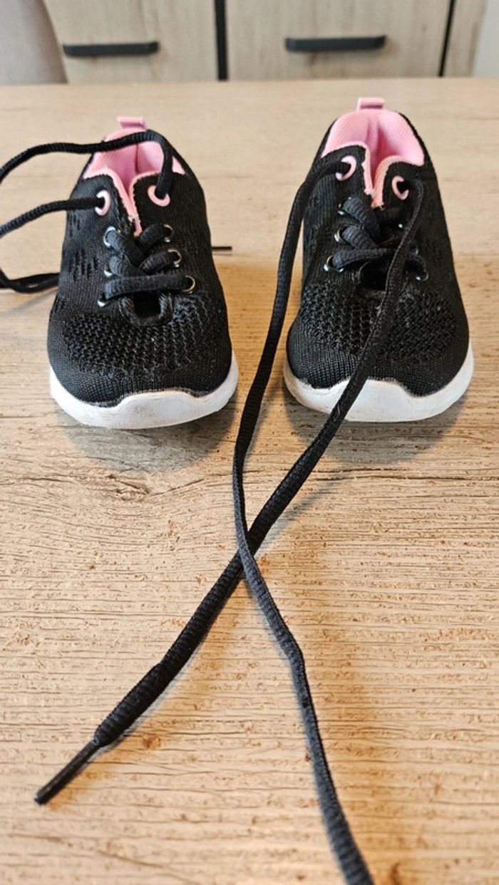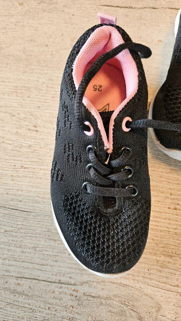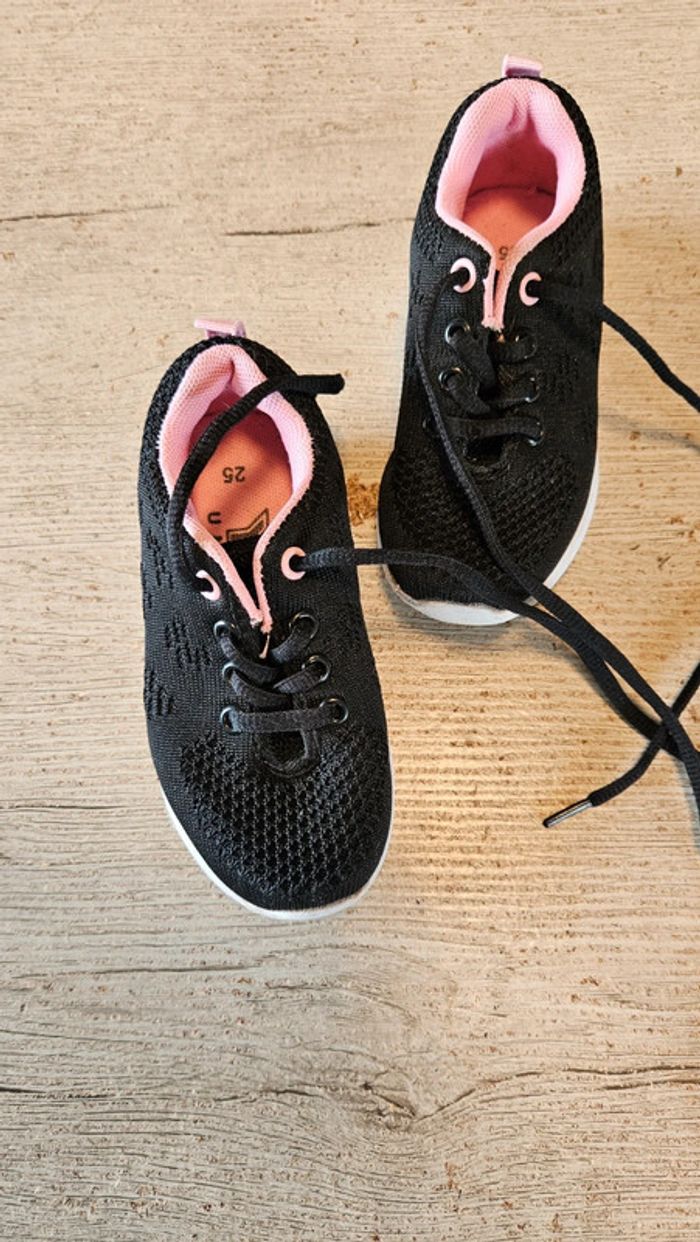 Paire de basket noire à lacet. Elles sont noires avec intérieur rose. Essayées quelques minutes mais ne conviennent pas et trop tard pour echanger. Etat impeccable. Convient bien pour du 25 #deborahtock_chaussures_enfant