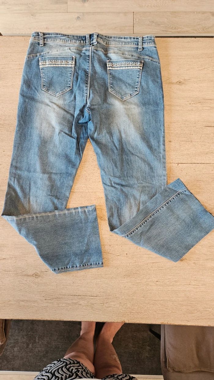 Jean s poue femme de longueur de 93 cm. Coupe droite. Il est très élastique. dentelle au bord des poches et à l intérieur de la taille. Se ferme par 1 bouton et 1 tirette. Convient bien pour du 44 #deborahtock_femmeXXL