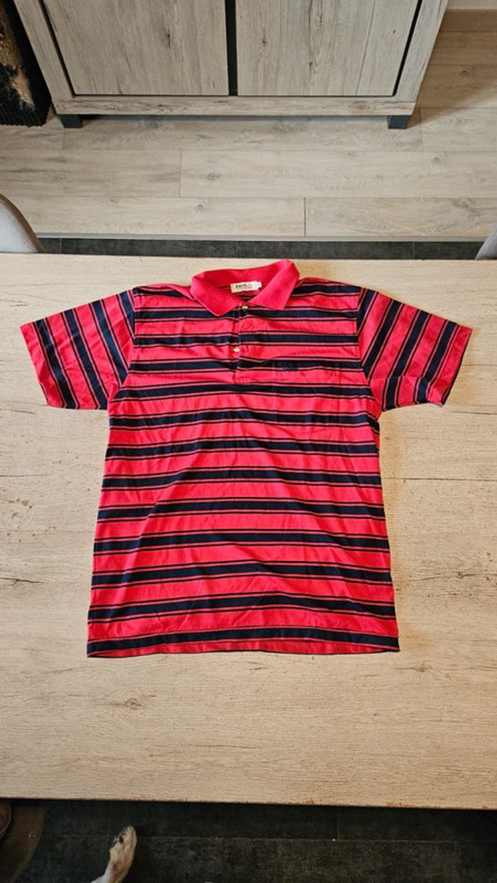Polo à manches courtes rouge à lignes bleu foncé. 2 boutons au col. Il a été mis mais peu. Convient bien pour du L #deborahtock_homme