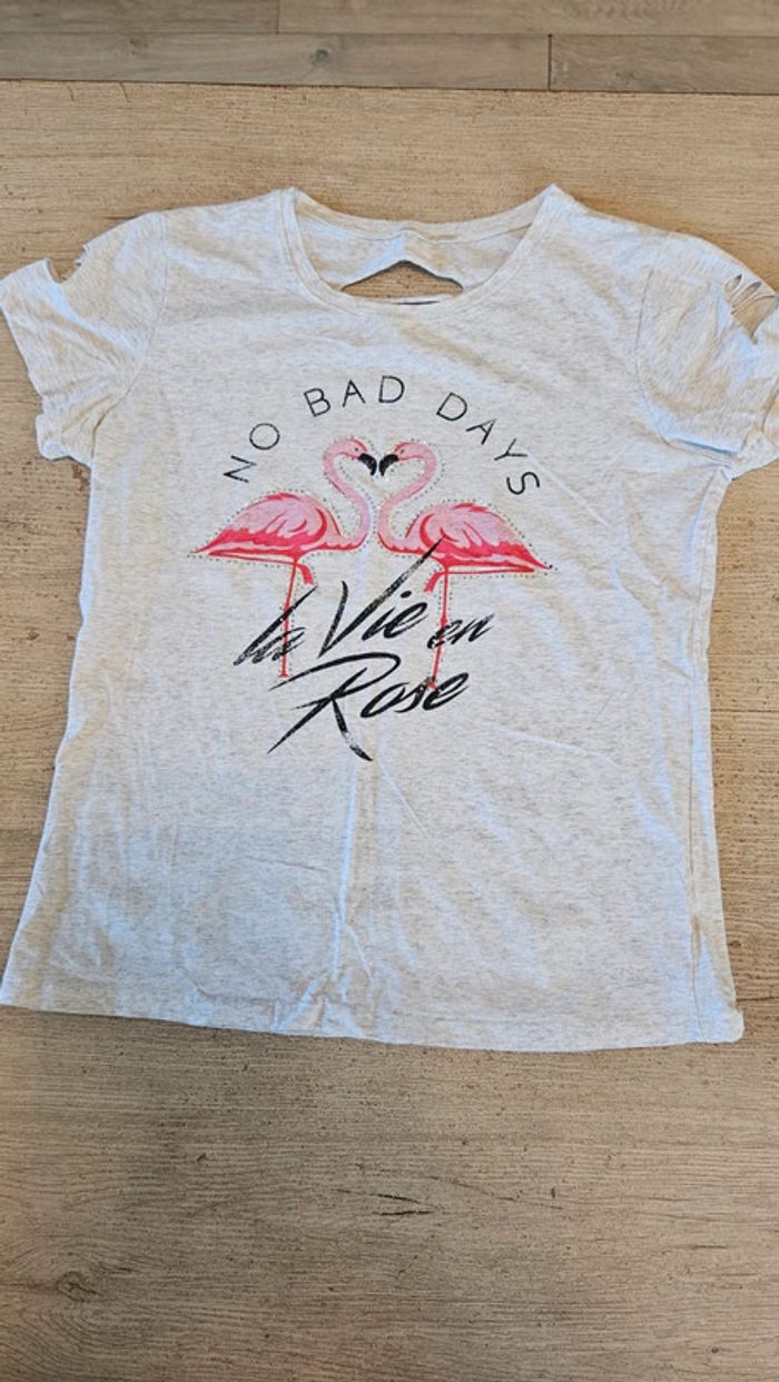 T shirt manches courtes, gris clair avec flamands roses et sequins, taille M/L - photo numéro 1