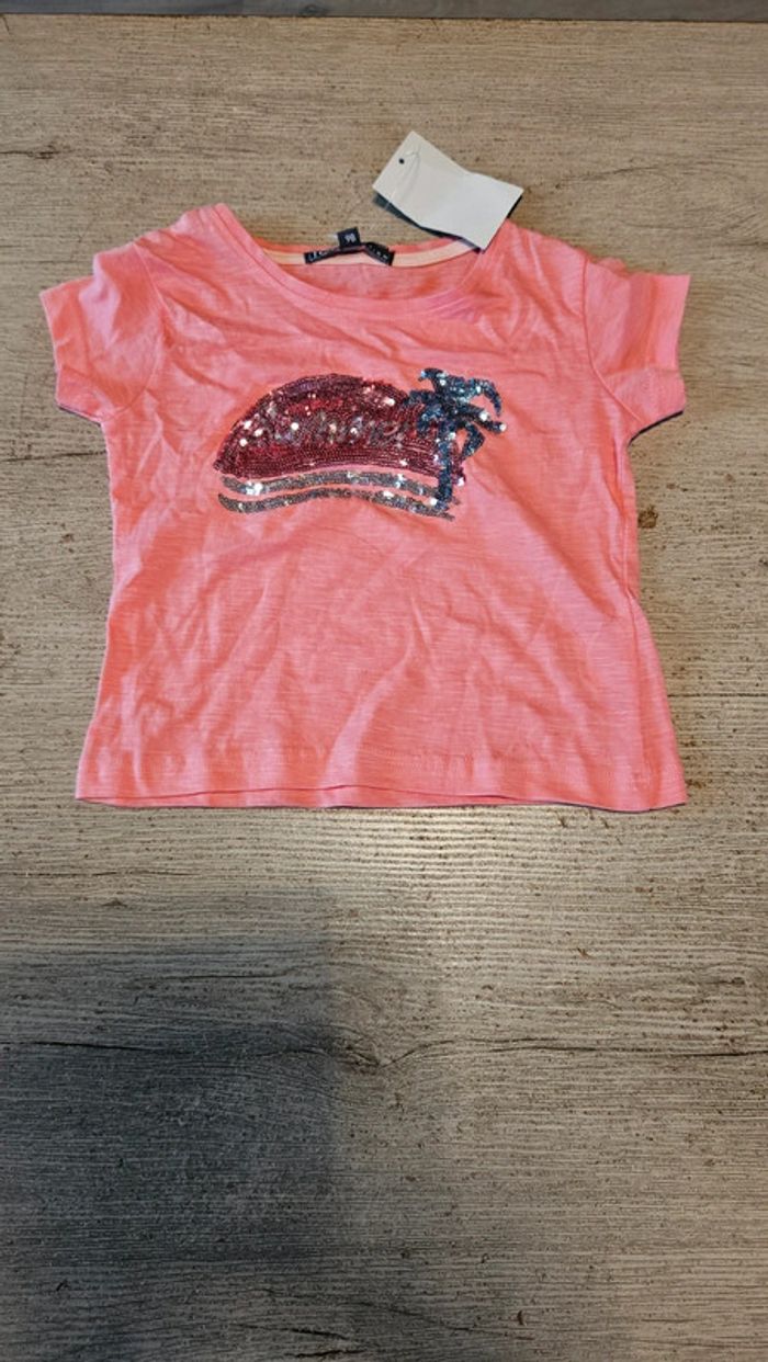 T shirt rose à manches courtes avec dessin en sequins. Jamais mis, toujours avec étiquette. Convient bien pour du 3 ans #deborahtock_3ans