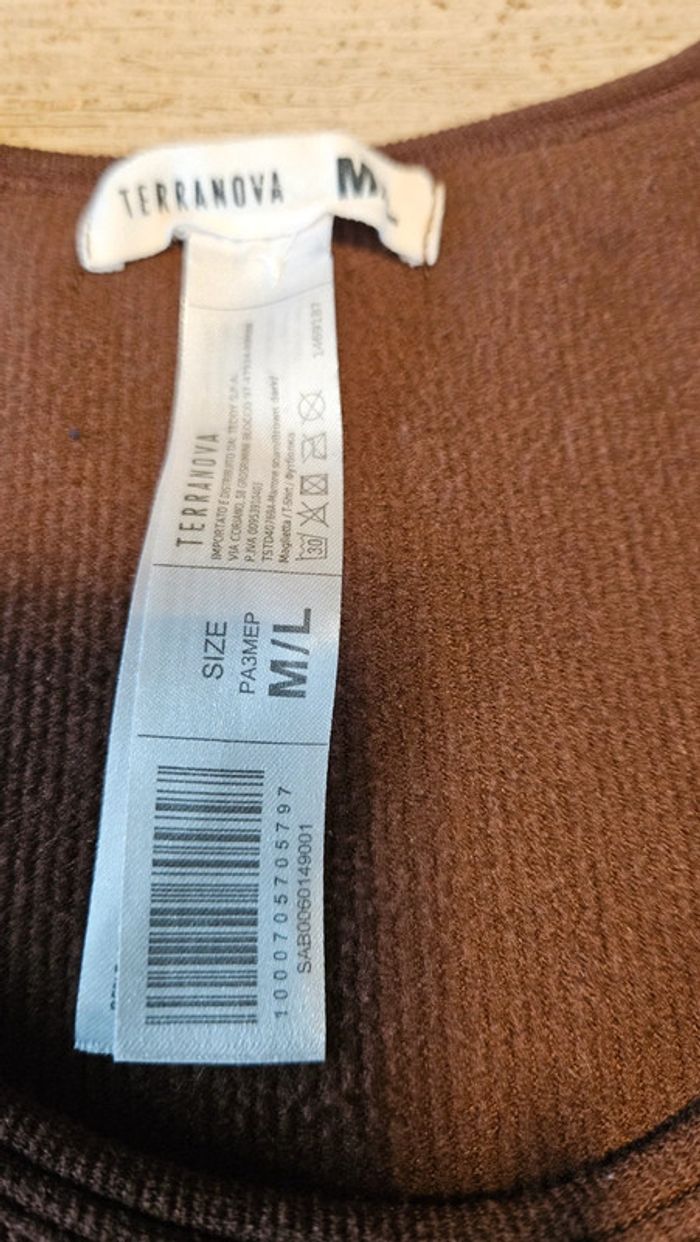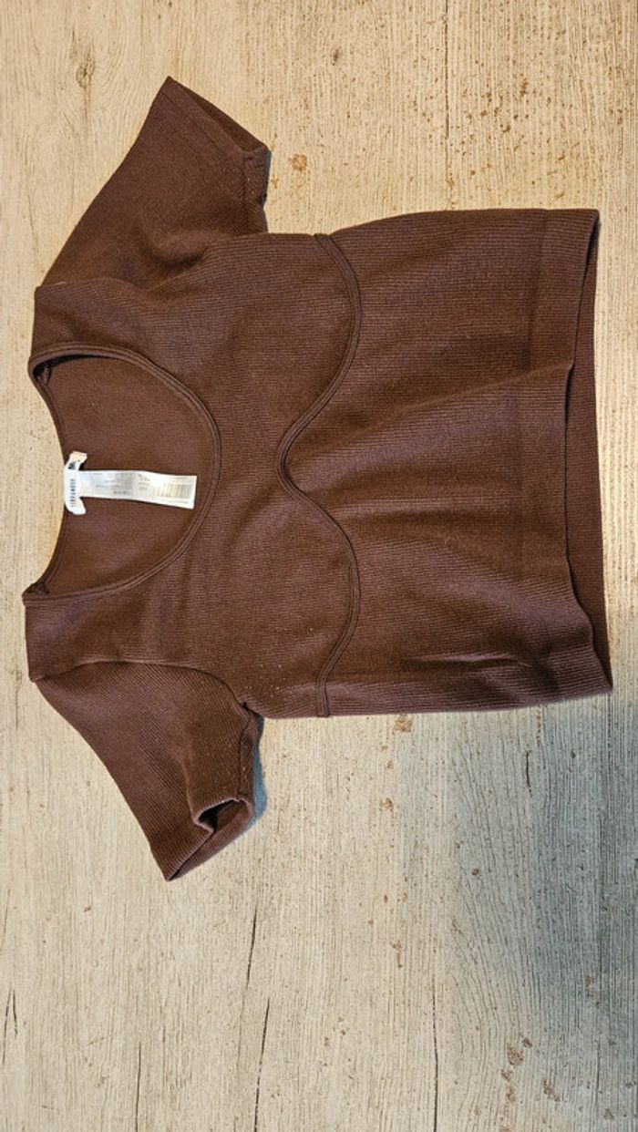 T shirt femme brun foncé avec couture en dessous de la poitrine. Finement cotellé. Court. Elastique. Très peu mis mais attention, quelques micro bouloches #deborahtock_femmeM #deborahtock_femmeL