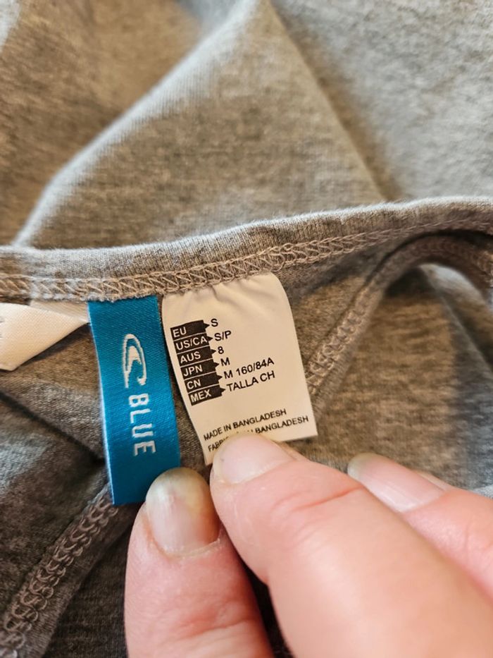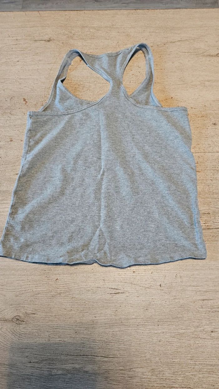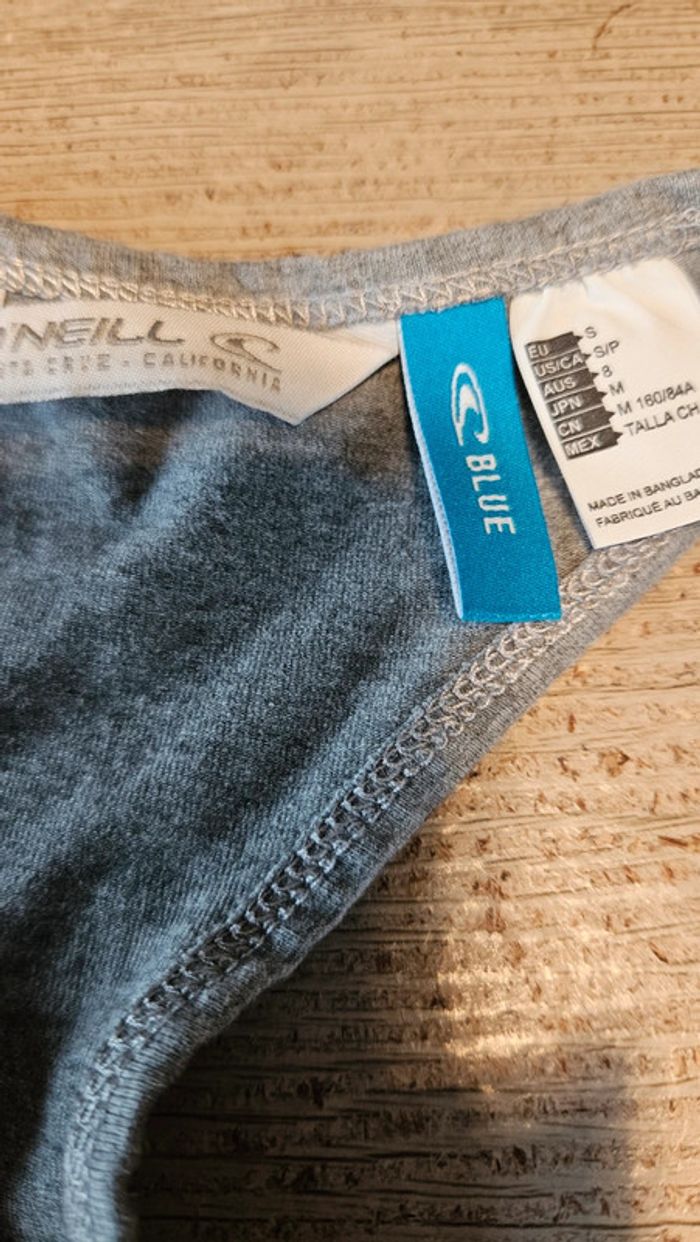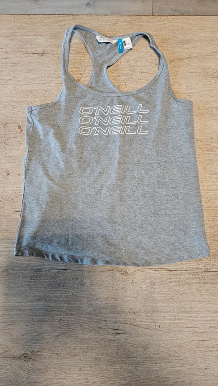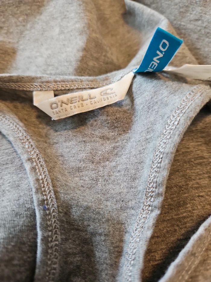 Débardeur de sport de couleur gris avec inscription O'Neill blanche. Il est très élastique, convient pour du S iu du M. Très peu mis voire pas du tout! Croisé dans le dos #deborahtock_sport #deborahtock_femmeS #deborahtock_femmeM
