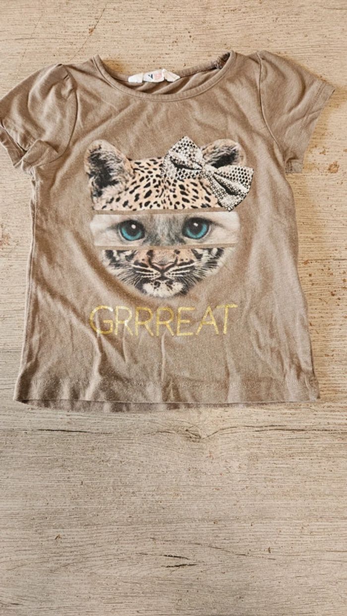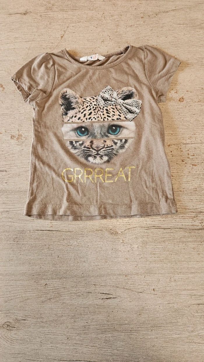 T shirt brun clair avec dessin, manches courtes, H&M, taille 4/6 ans - photo numéro 1