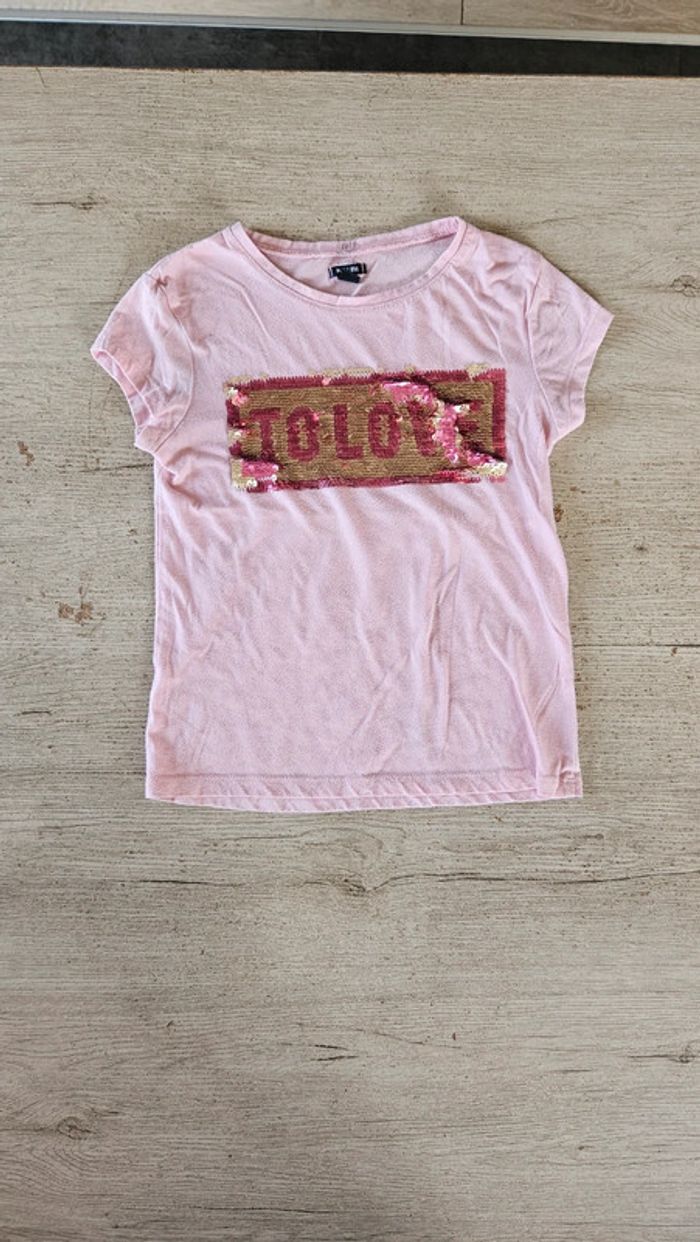 T shirt rose clair à manches courtes, avec inscriptions sequins, Kiabi, 8 ans - photo numéro 1