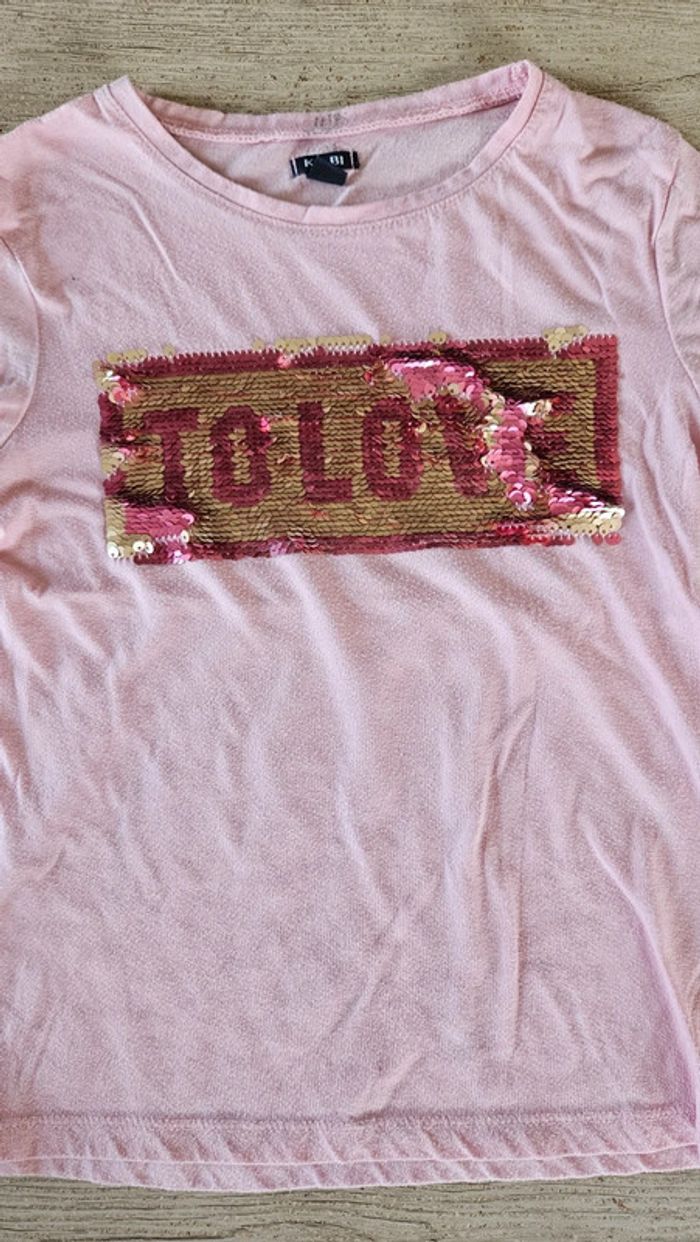 T shirt rose clair à manches courtes, avec inscriptions sequins, Kiabi, 8 ans - photo numéro 2