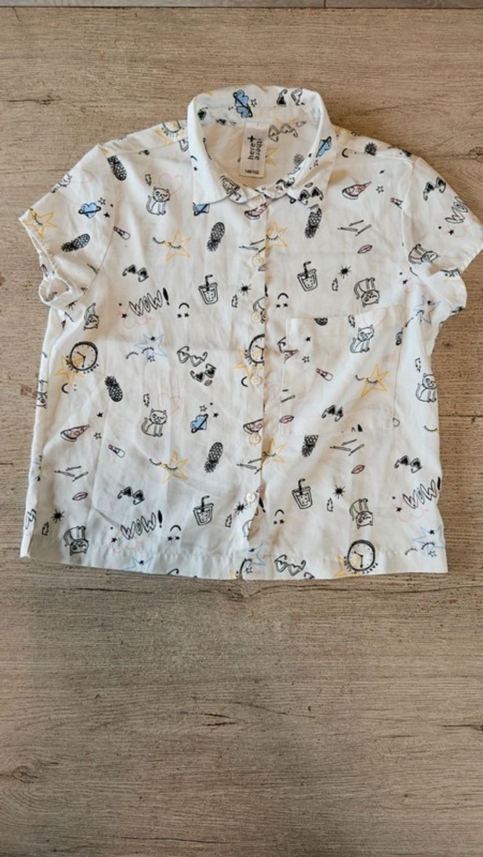 Chemise fille blanc cassé avec dessins noirs, jaunes clair et bleu. Se ferme par des boutons. Mise 1 seule fois. Convient bien pour du 11 à 12 ans #deborahtock_11ans #deborahtock_12ans