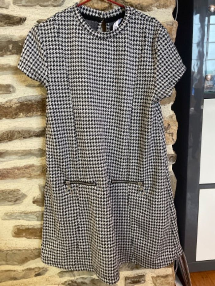 Robe grise et noire. À motif. Robe à manches courtes et avec poches. Taille 10ans