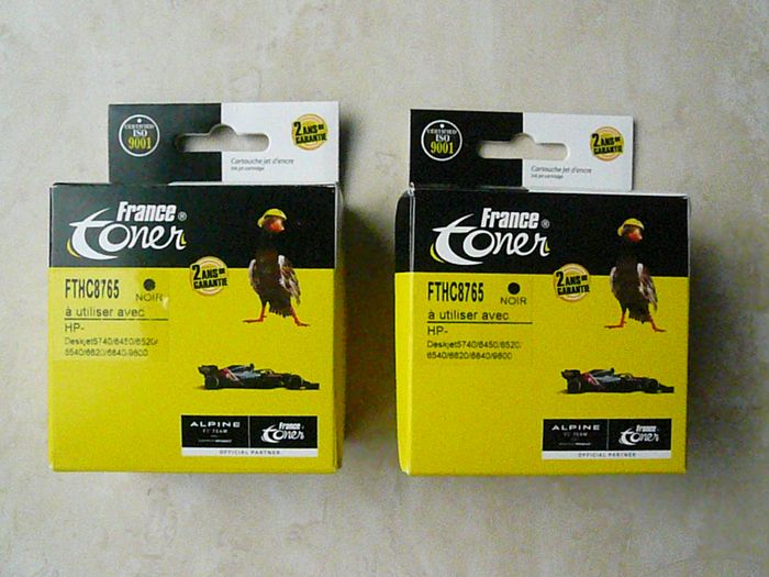 Lot de 2 cartouches Marque France Toner FTHC8765. Cartouches d’encre noir équivalent HP338. Fonctionnent avec les imprimantes Deskjet 5740/6450/6520/6540/6620/6840/9800. Cause changement d'imprimante (imprimante HS). Neuves, sous blister. N’hésitez pas à regarder mes autres annonces pour réduire les frais de port.