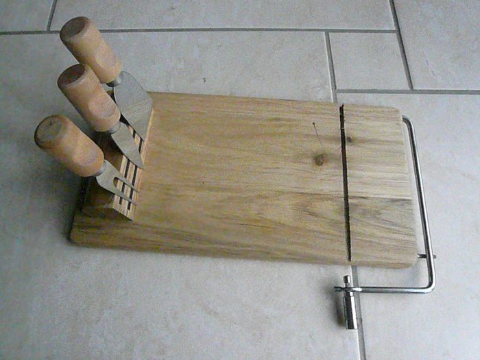 Plateau à fromage avec 3 ustensiles à fromage aimantés et une lyre intégrée pour couper et servir les fromages. Neuf, jamais servi. N’hésitez pas à regarder mes autres annonces pour réduire les frais de port.