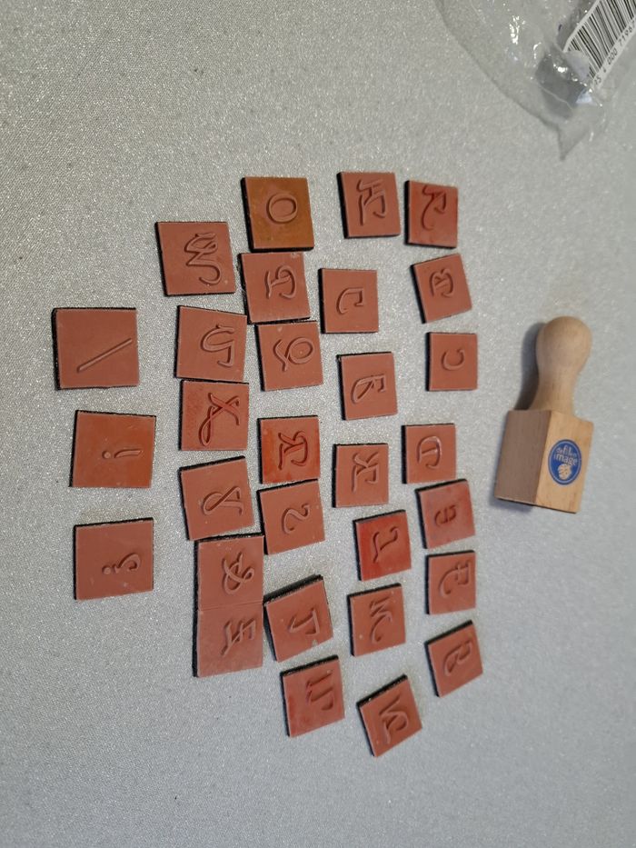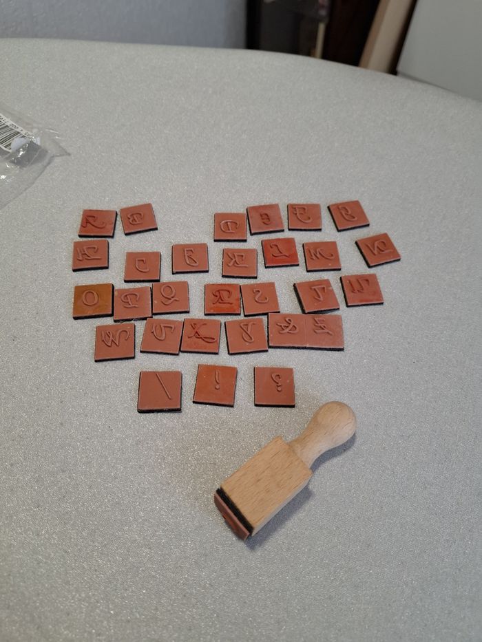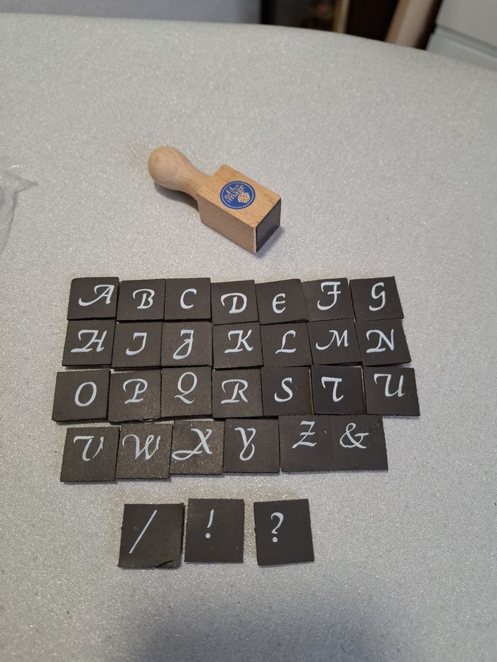 Tampon en bois aimanté, marque DE FIL EN IMAGE, avec un alphabet complet + 1 esperluette + 3 signes de ponctuation / ! ? Chaque lettre en caoutchouc est aimantée au dos. Totalement neuf, jamais utilisé.