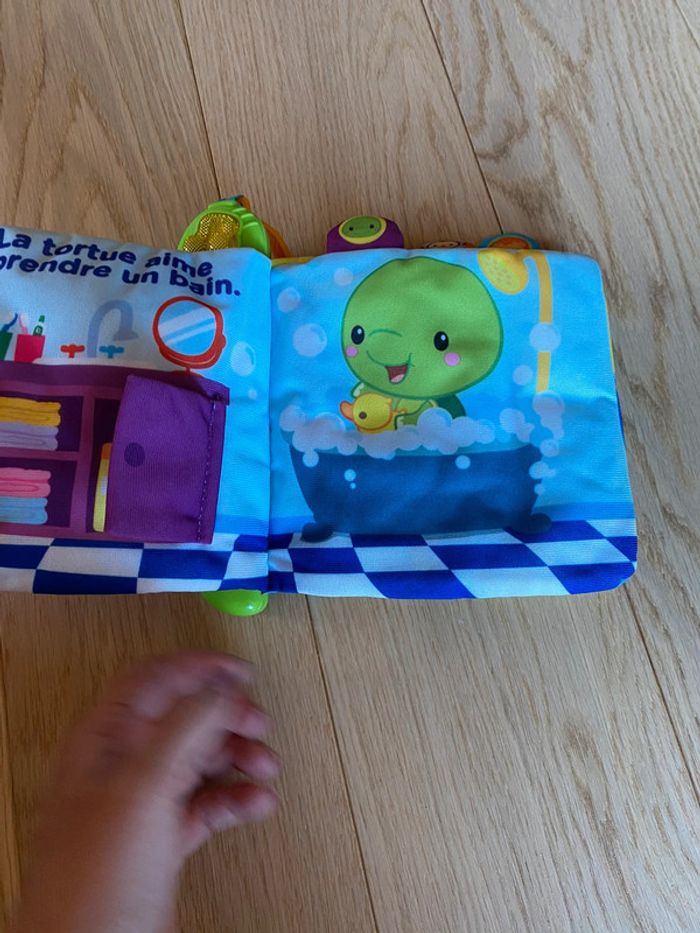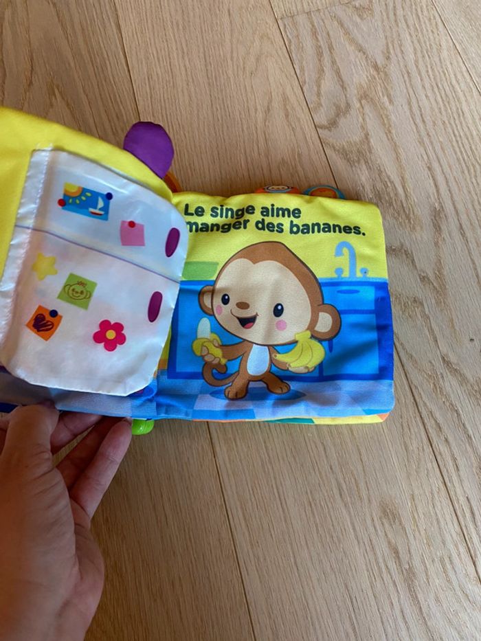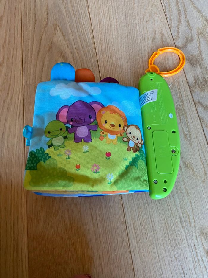 Baby livre à surprise tout doux Baby Livre à surprises vtech . .Un livre en tissu tout doux avec 6 pages interactives 3 boutons pour découvrir les animaux, les objets, les couleurs et écouter des chansons. Système d'attache pour fixer le livre partout. 4 chansons et 20 mélodies. En parfait état
