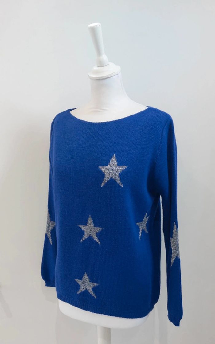 Pull d'hiver bleu motifs étoiles argentées taille S - photo numéro 2