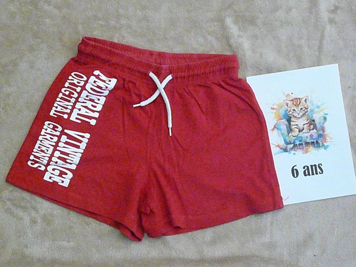 Tenue de sport composée de : - 1 short rouge avec ceinture élastique, - 1 sweat rouge à capuche assorti. Très bon état. N’hésitez pas à regarder mes autres annonces pour réduire les frais de port.