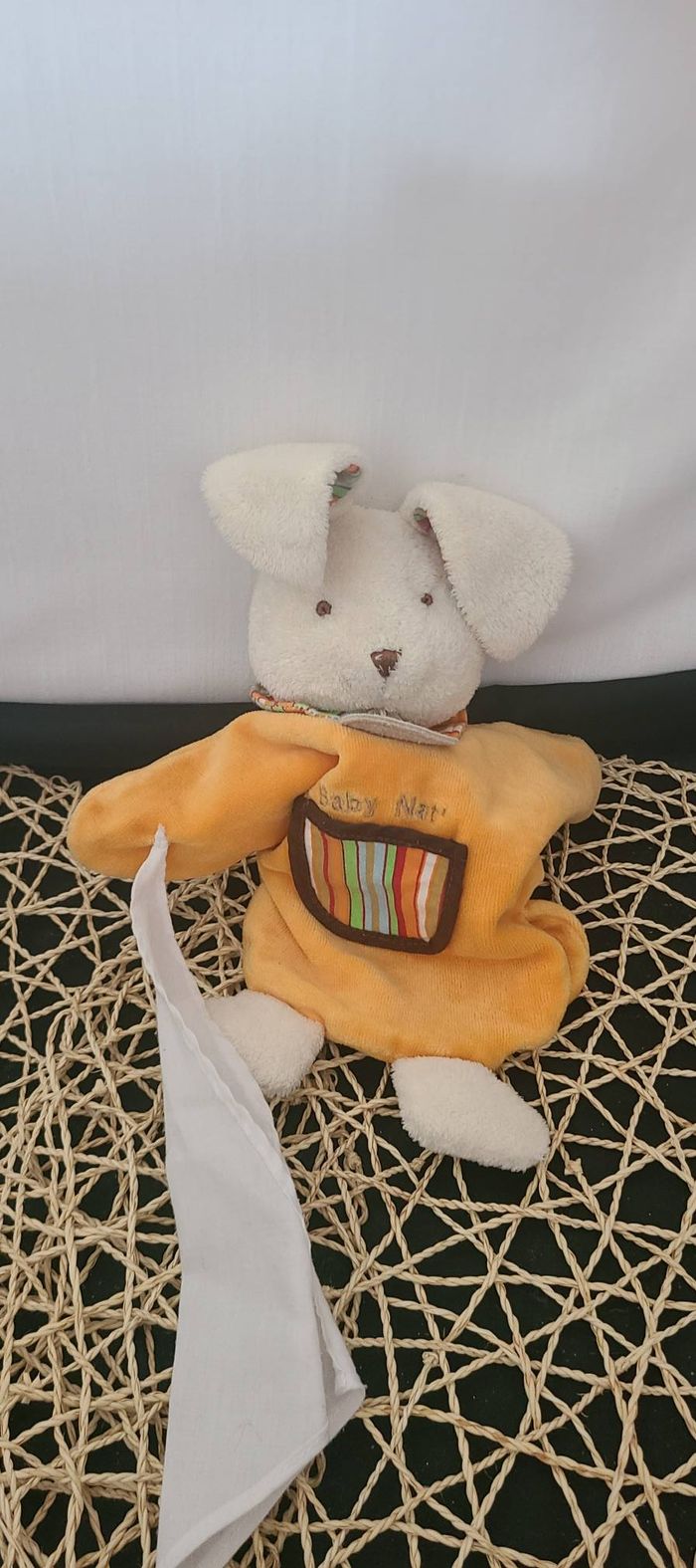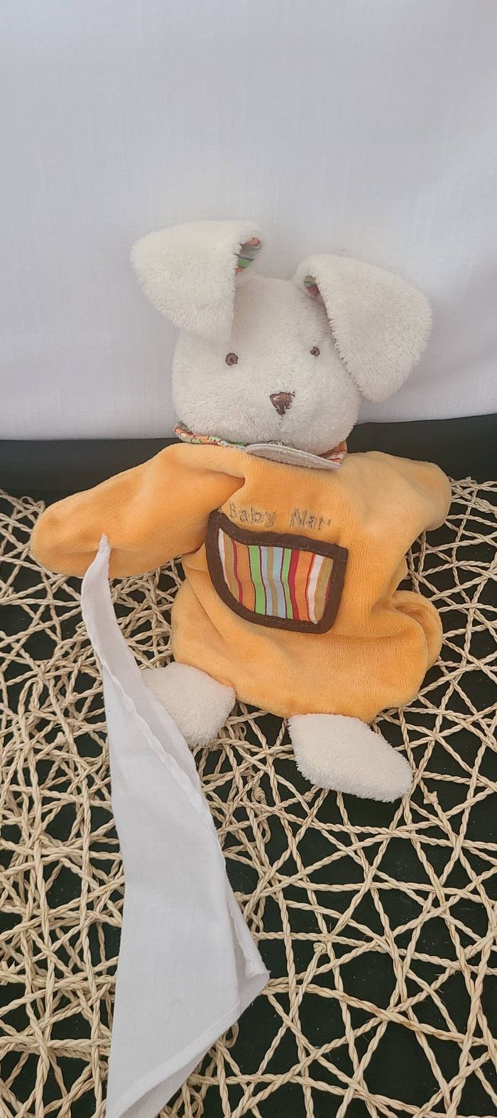 DOUDOU PLAT MARIONNETTE BABY NAT LAPIN ORANGE VERT mouchoir blanc - photo numéro 1