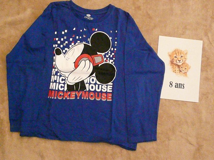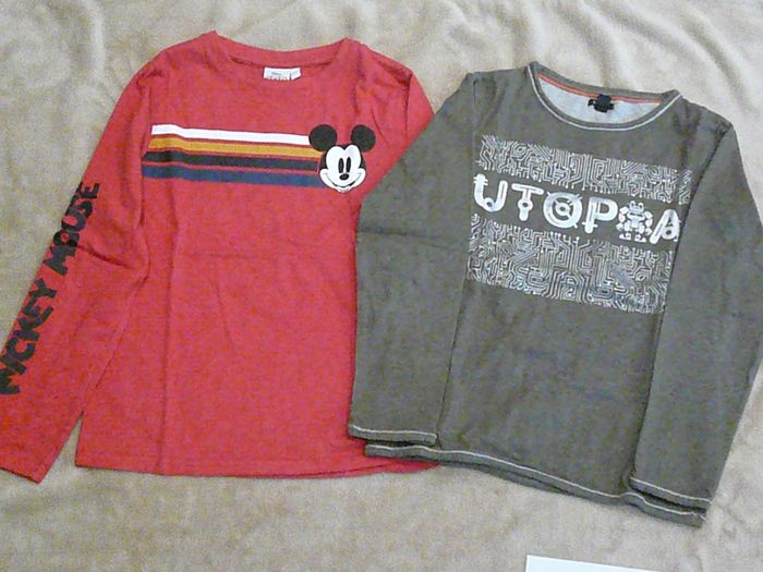 Lot de 3 tee-shirts manches longues : - Un tee-shirt bleu à motif Marque Disney Mickey Mouse, - Un tee-shirt kaki à motif, - Un tee-shirt rouge à motif Marque Disney Mickey Mouse. Très bon état. N’hésitez pas à regarder mes autres annonces pour réduire les frais de port.