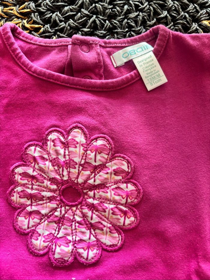 Jolie T-shirt obaibi, 18 mois, très bon état. Légère trace d’épingle devant derrière