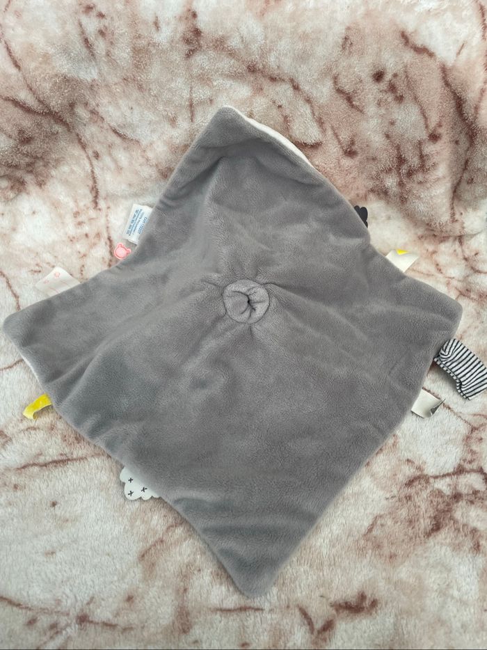 Doudou plat Ours Sam blanc gris rayé Porté une couronne jaune sur la tête Au dos uni gris Attache tétine +/- 25cm Noukie’s Occasion en très bon état Vous achetez le doudou que vous voyez sur la photo
