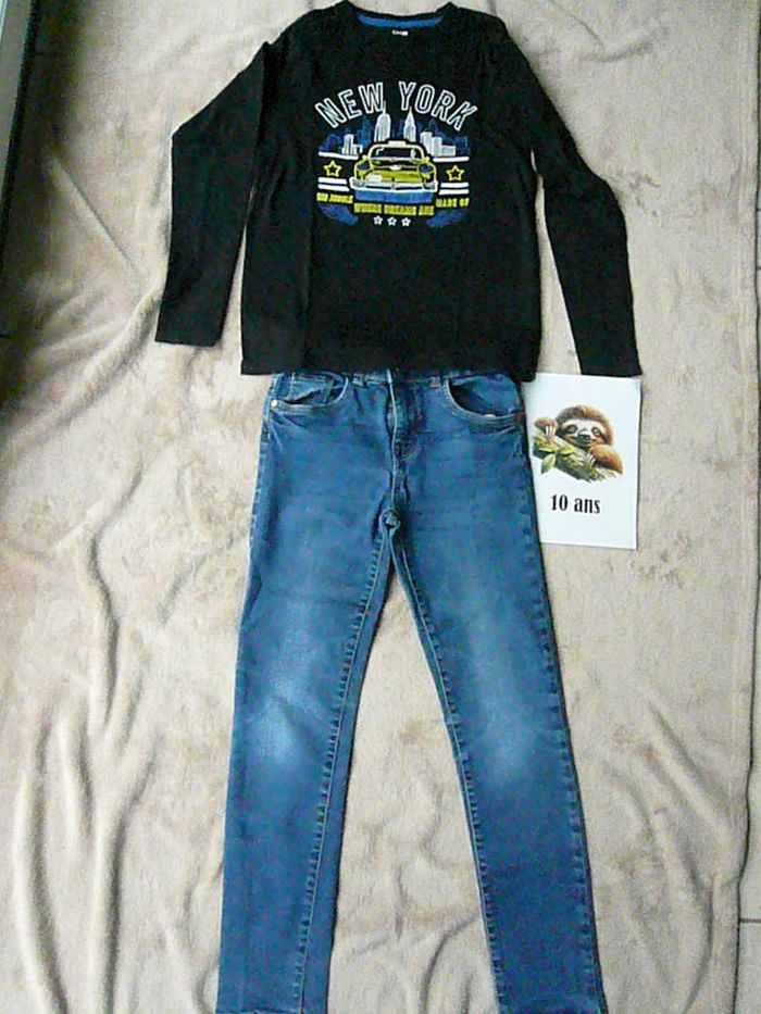 Ensemble taille 10 ans composé de : - 1 jean bleu avec ceinture réglable, - 1 tee-shirt noir à motif assorti. Très bon état. N’hésitez pas à regarder mes autres annonces pour réduire les frais de port.